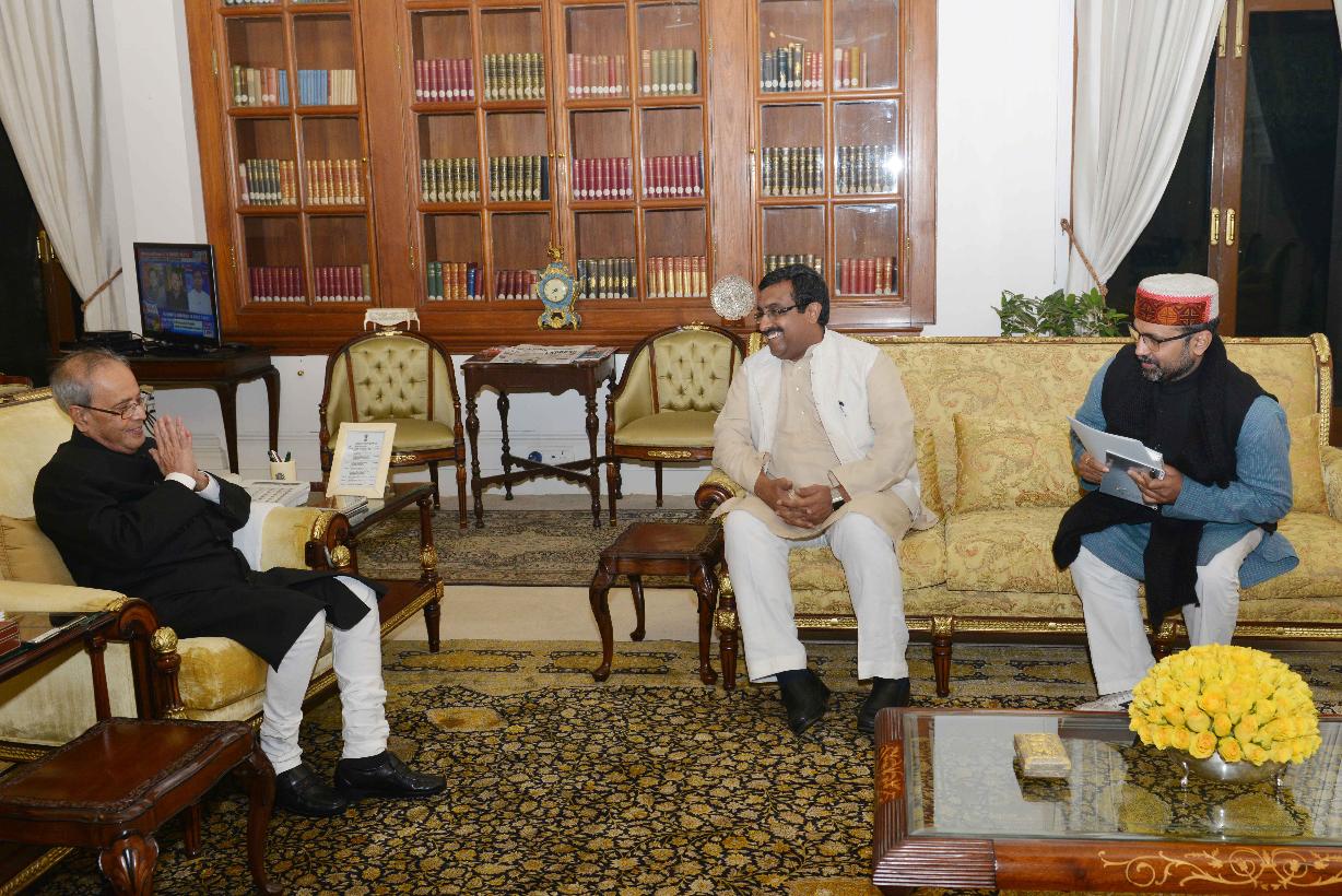 | Caption: | The President of India, Shri Pranab Mukherjee meeting with Shri Ram Madhav, National General Secretary, Bharatiya Janata Party, at Rashtrapati Bhavan on December 27, 2016. |