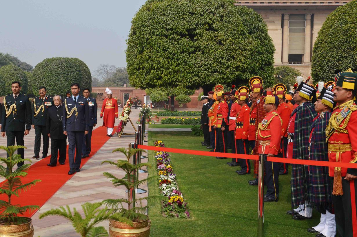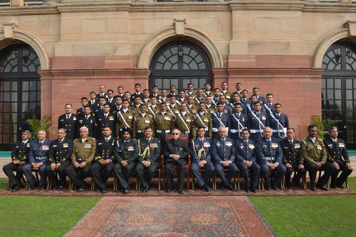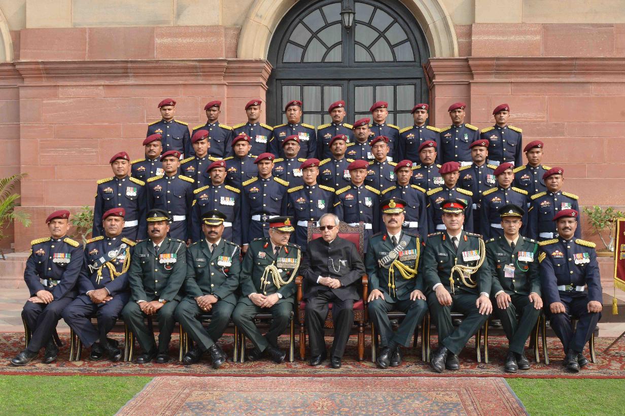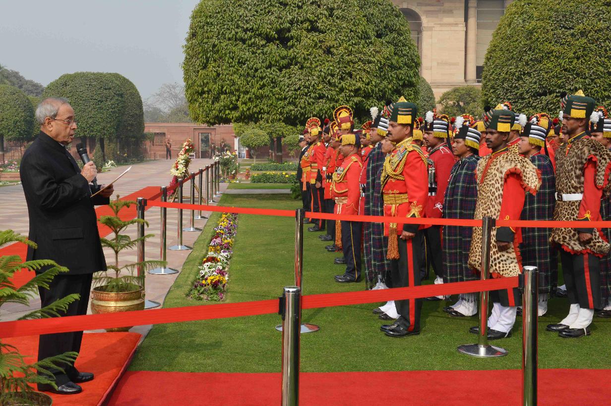 | Caption: | The President of India, Shri Pranab Mukherjee with the personnel of Tri Service Band Contingents (participants of the Beating Retreat Ceremony) and Provost Outriders of the Three Services, at Rashtrapati Bhavan on January 30, 2016. |