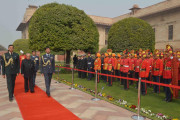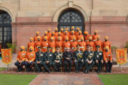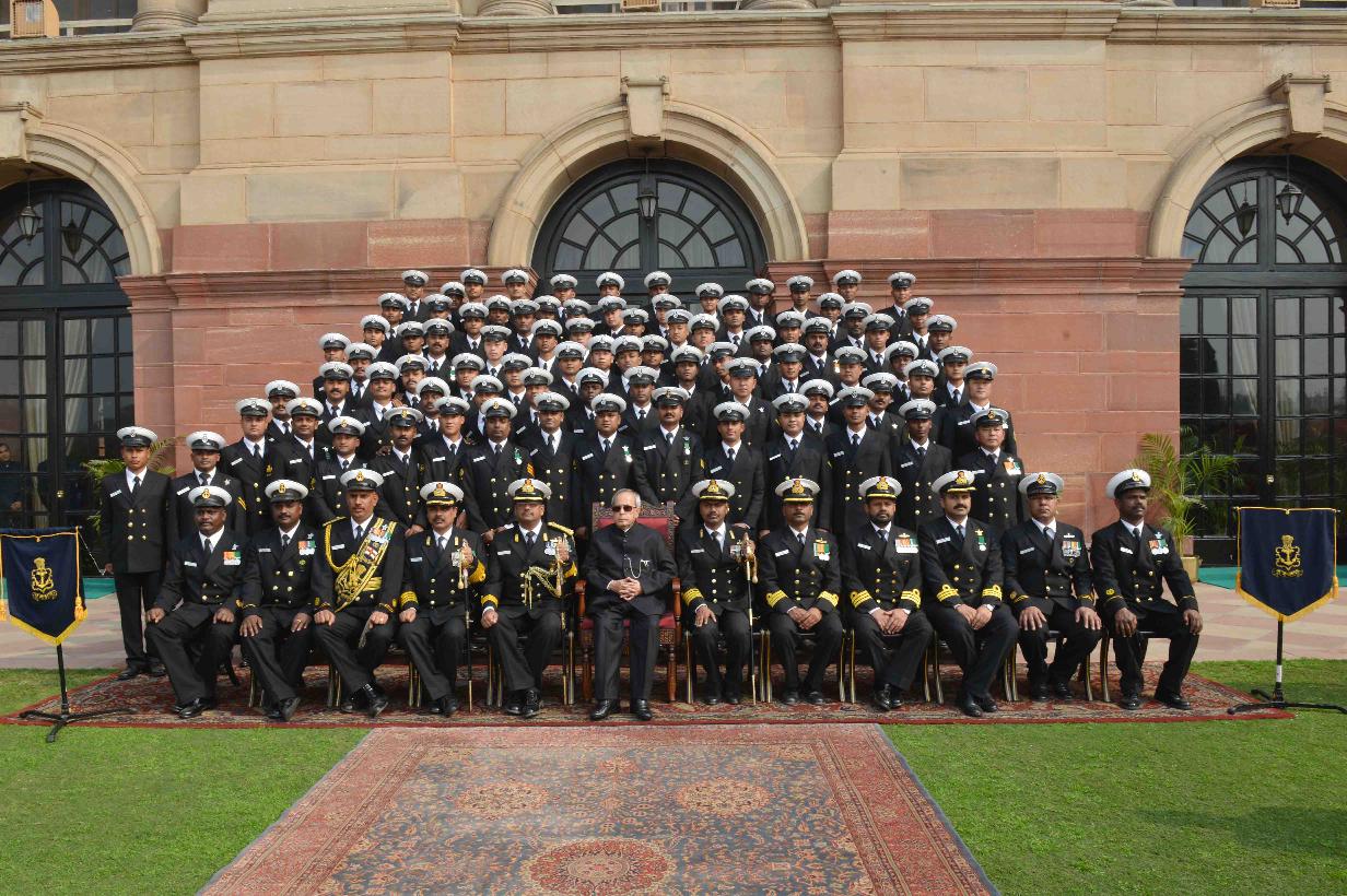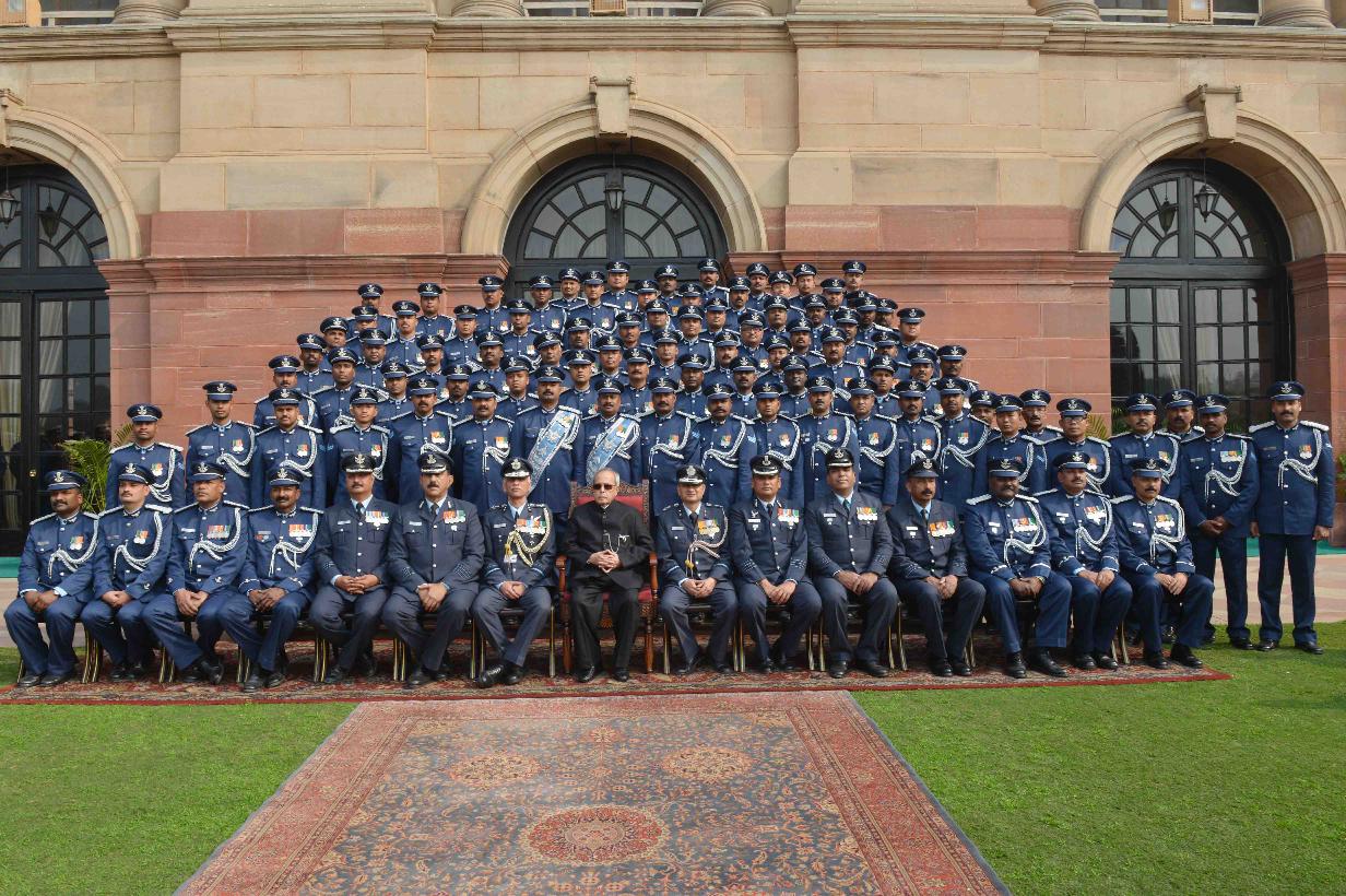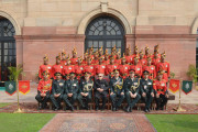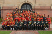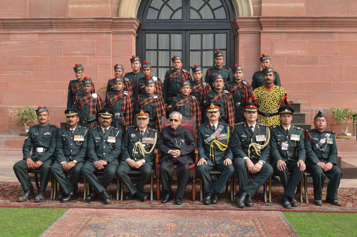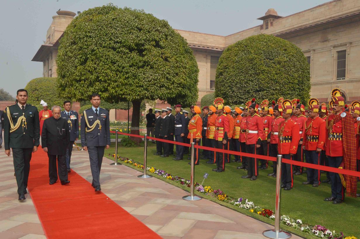 | Caption: | The President of India, Shri Pranab Mukherjee with the personnel of Tri Service Band Contingents (participants of the Beating Retreat Ceremony) and Provost Outriders of the Three Services, at Rashtrapati Bhavan on January 30, 2016. |