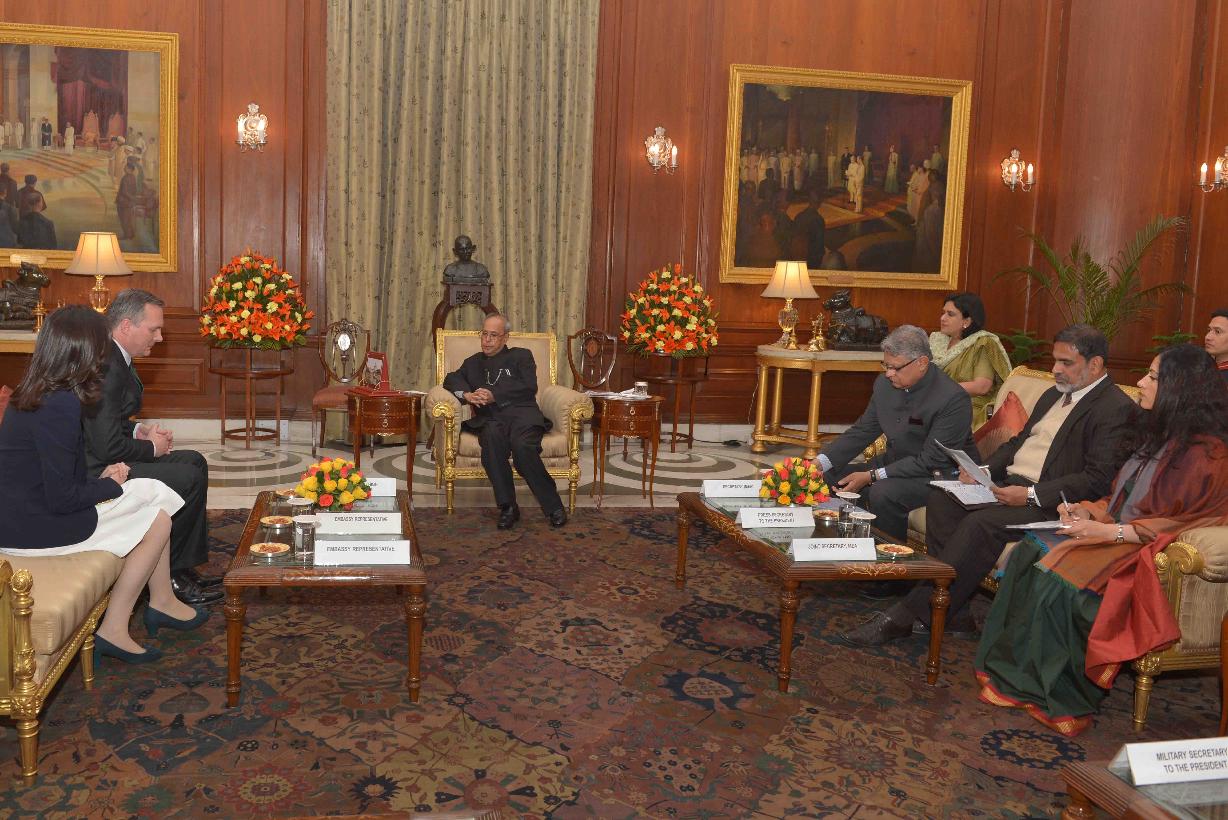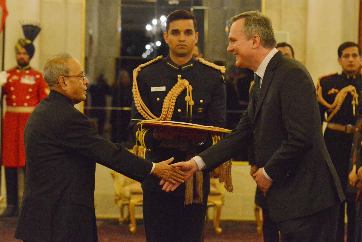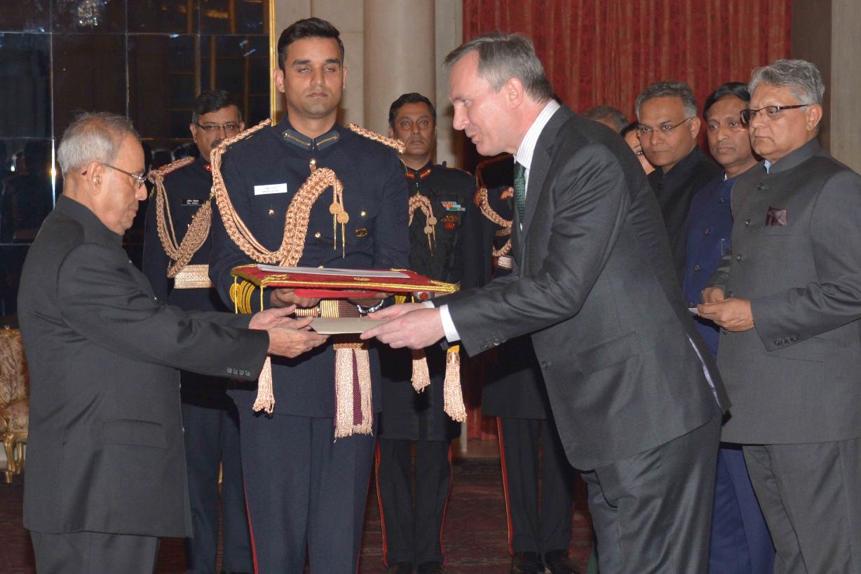 | Caption: | The Ambassador-designate of Ireland, HE Mr. Brian McElduff presenting his Credentials to the President of India, Shri Pranab Mukherjee, at Rashtrapati Bhavan on February 03, 2016. |