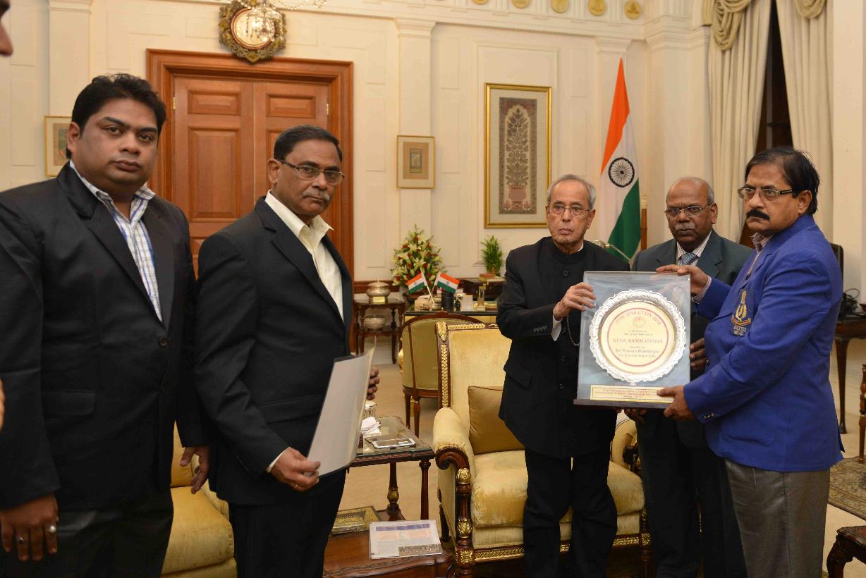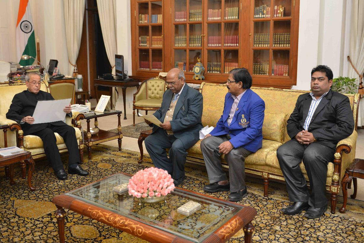 | Caption: | The President of India, Shri Pranab Mukherjee meeting with Shri Ajoy Kumar Das along with Shri Dinkar Rao, Shri S.S. Gupta and Shri Sevabrata Das from Kolkata, at Rashtrapati Bhavan on January 08, 2016. |