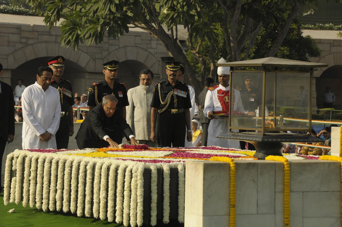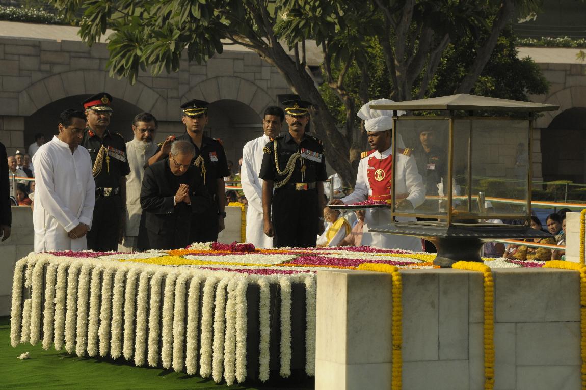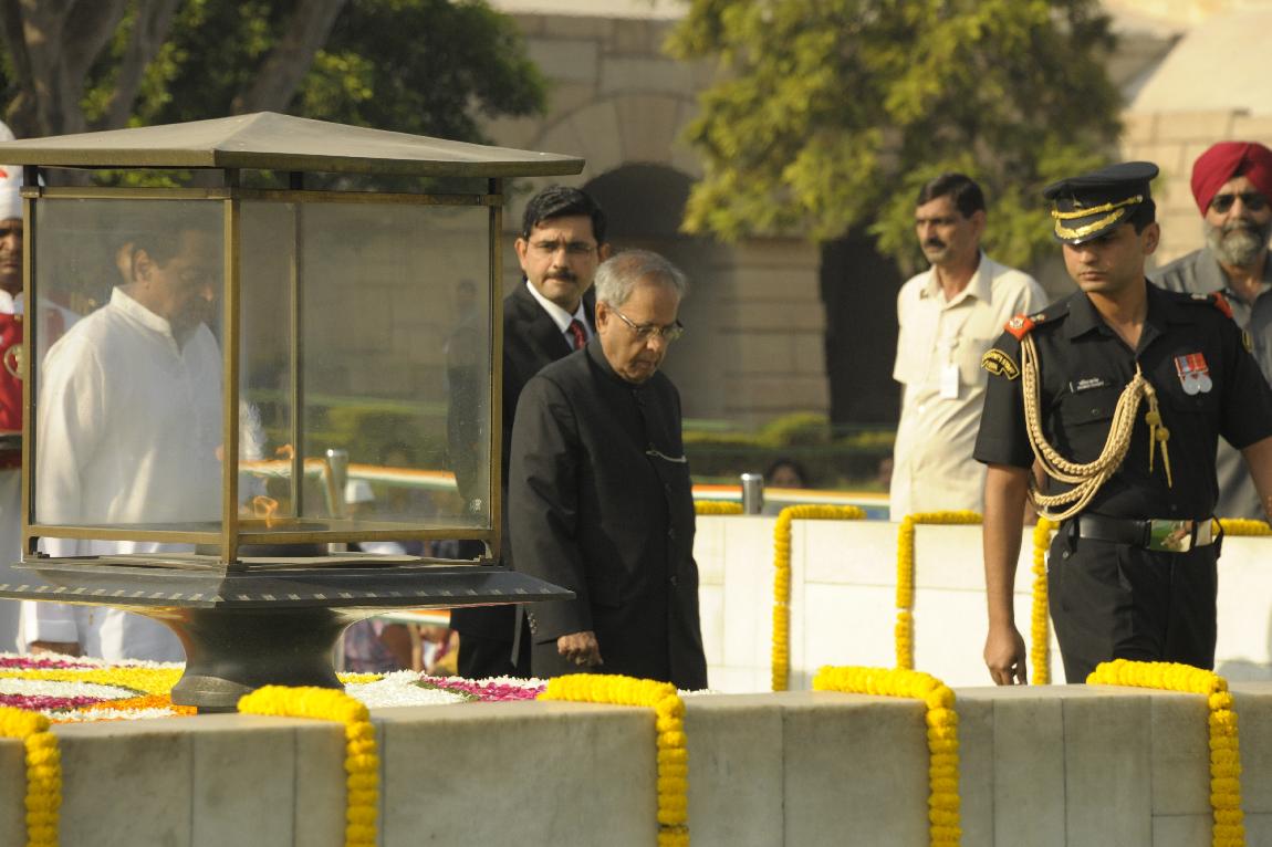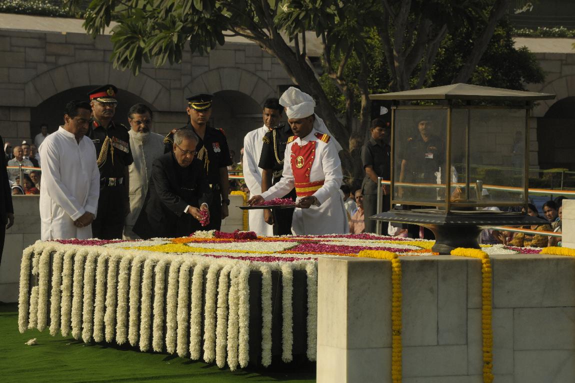 | Caption: | The President of India, Shri Pranab Mukherjee Paying Homage at The Samadhi of Mahatma Gandhi on the Occasion of his 143th Birth Anniversary at Rajghat on October 02, 2012 |