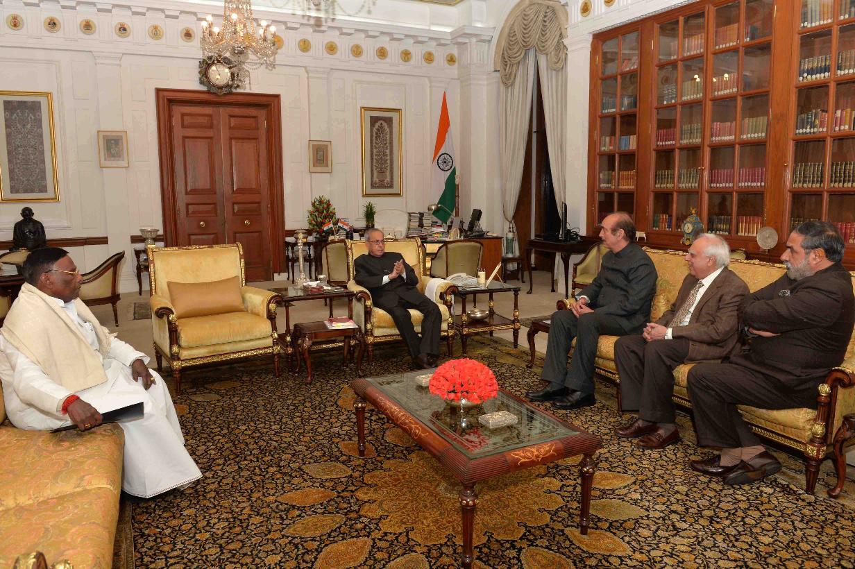 | Caption: | The President of India, Shri Pranab Mukherjee meeting with Shri Ghulam Nabi Azad, Leader of Opposition, Rajya Sabha, Shri Anand Sharma, Deputy Leader of Opposition, Rajya Sabha, Shri V. Narayanasamy, former Union Minister of State & In-Charge, North Eastern States, AICC and Shri Kapil Sibal, Senior Congress Leader, at Rashtrapati Bhavan on February 16, 2016. |