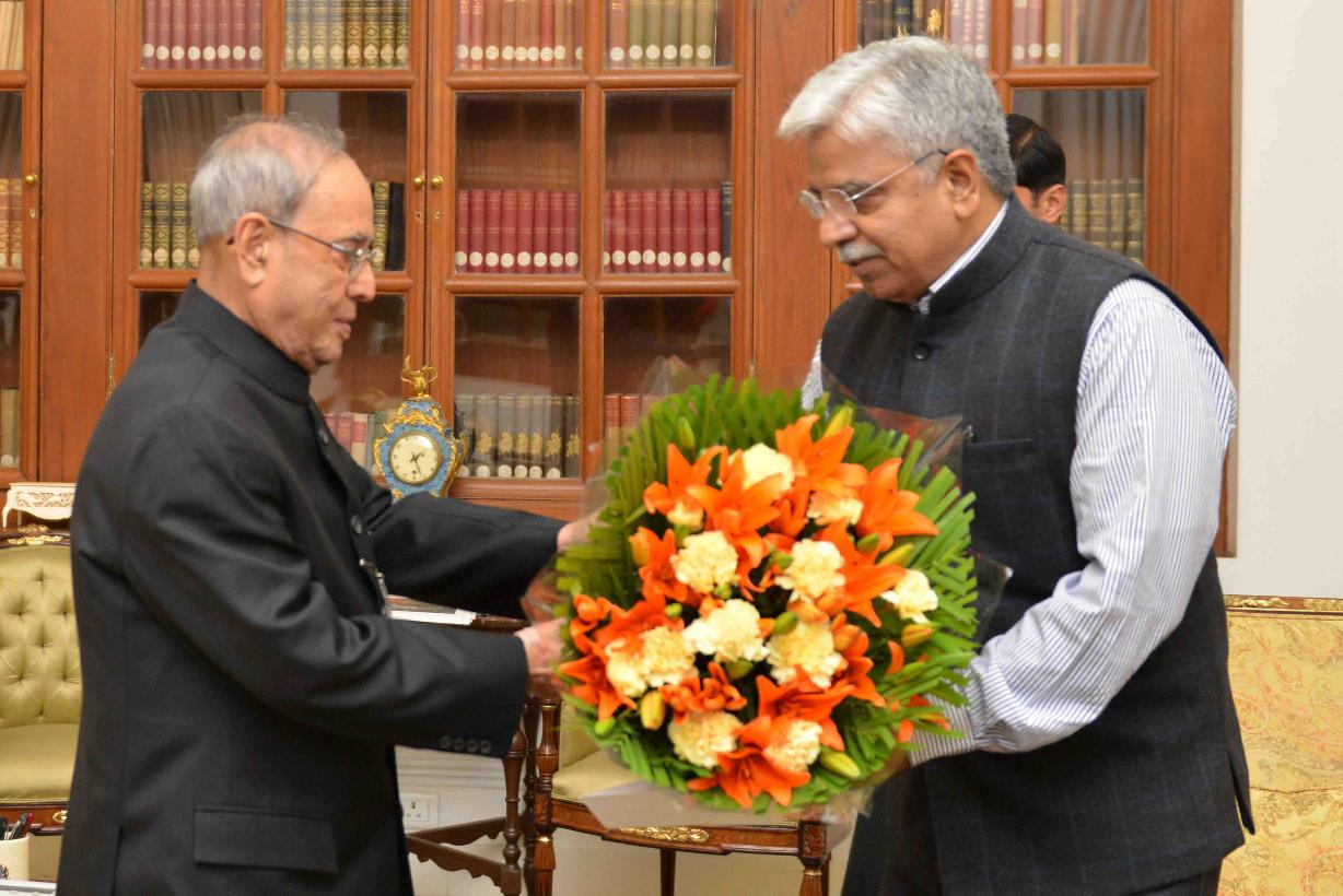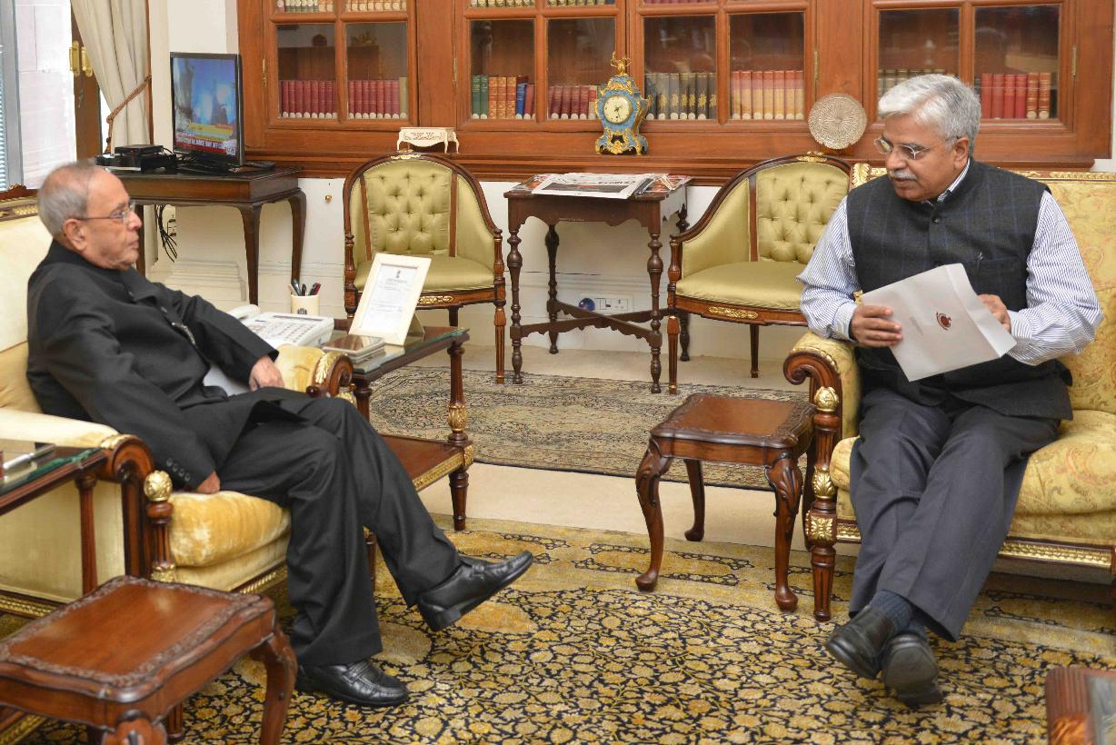 | Caption: | The President of India, Shri Pranab Mukherjee meeting with Shri Bhim Sain Bassi, Commissioner of Police, Delhi, at Rashtrapati Bhavan on February 13, 2016. |