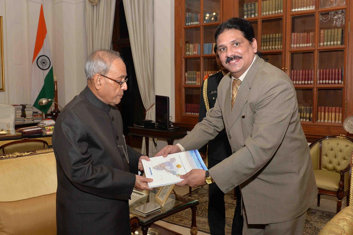 | Caption: | The President of India, Shri Pranab Mukherjee receiving a book '' Indian Maritime Strategy'' from Dr. GVR Shastri, Chairman, Coastal India Development Council, at Rashtrapati Bhavan on February 16, 2016. |