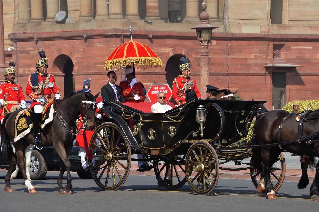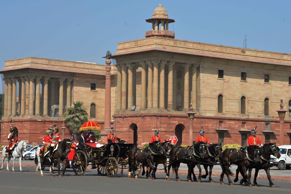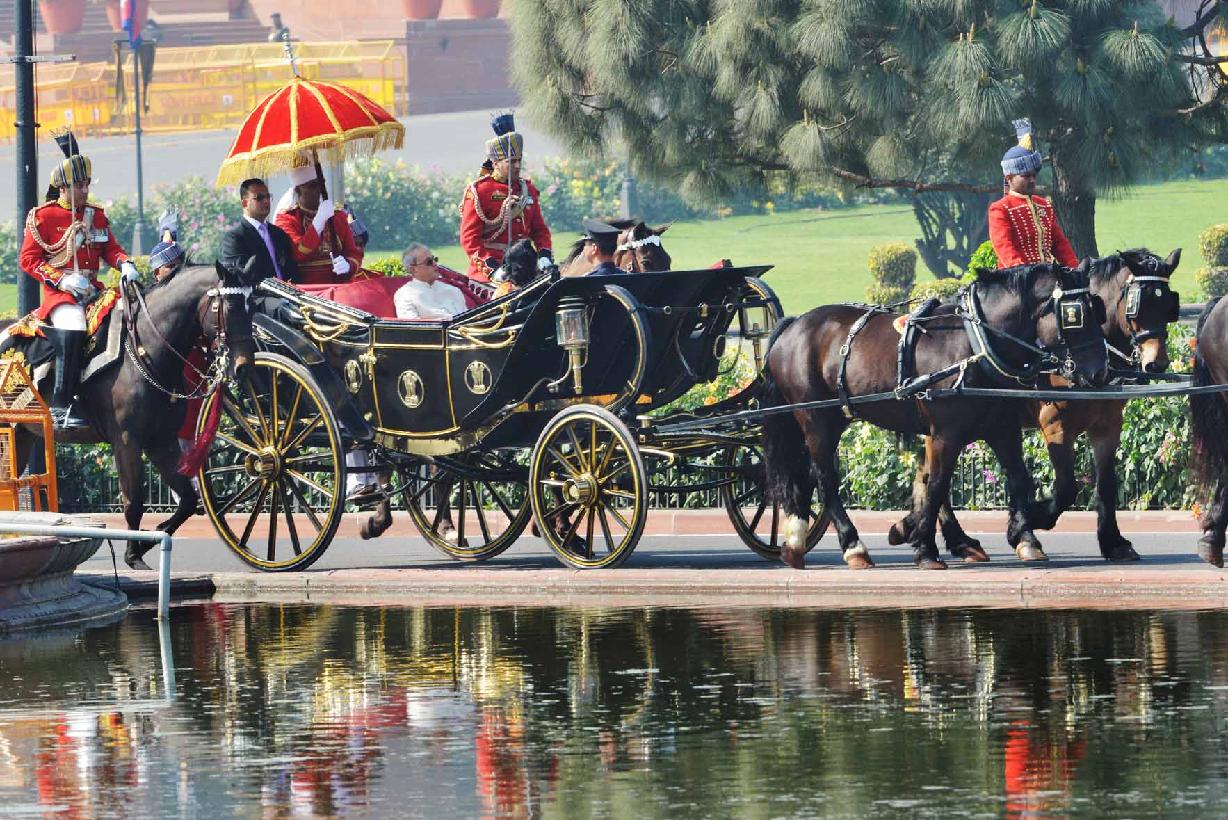 | Caption: | The President of India, Shri Pranab Mukherjee leaving Forecourt for Central Hall of Parliament to deliver his address to both the Houses of Parliament in New Delhi on February 23, 2016. |