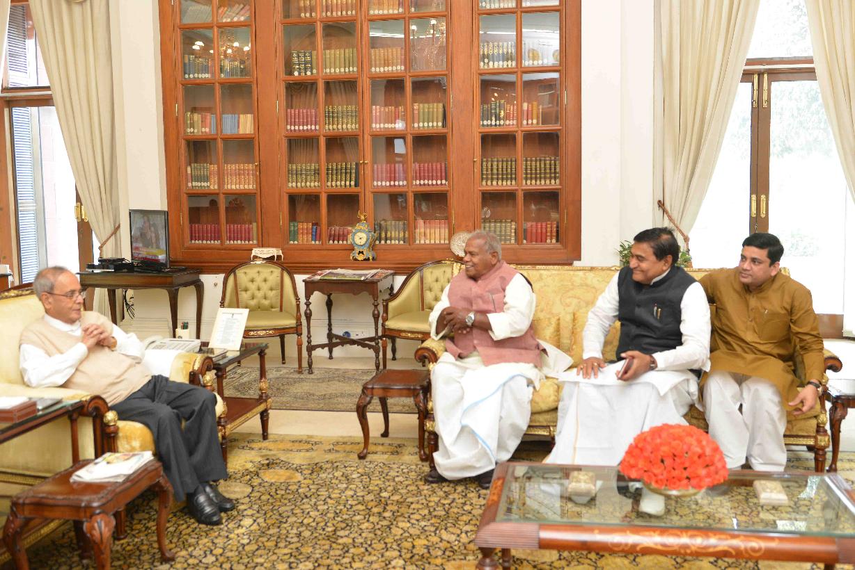 | Caption: | The President of India, Shri Pranab Mukherjee meeting with Shri Jitan Ram Manjhi, Ex-Chief Minister of Bihar alongwith Shri Mahachandra Prasad Singh, Ex-Minister, Bihar and Shri Danish Rizwan, at Rashtrapati Bhavan on February 20, 2016. |