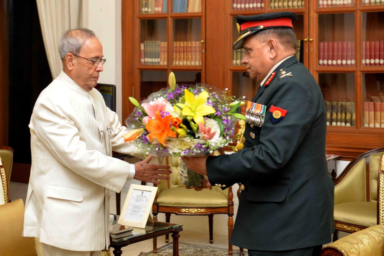 | Caption: | The President of India, Shri Pranab Mukherjee meeting with Lt. Gen. Rakesh Nandan, Director General, Discipline Ceremonial & Welfare (DC & W), AG's Branch & Hony ADC to the President, at Rashtrapati Bhavan on February 12, 2016. |