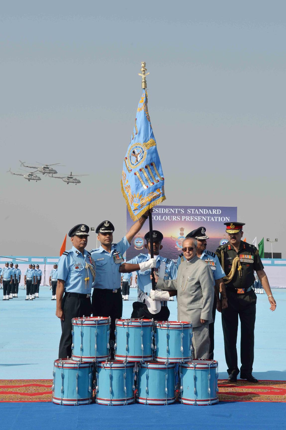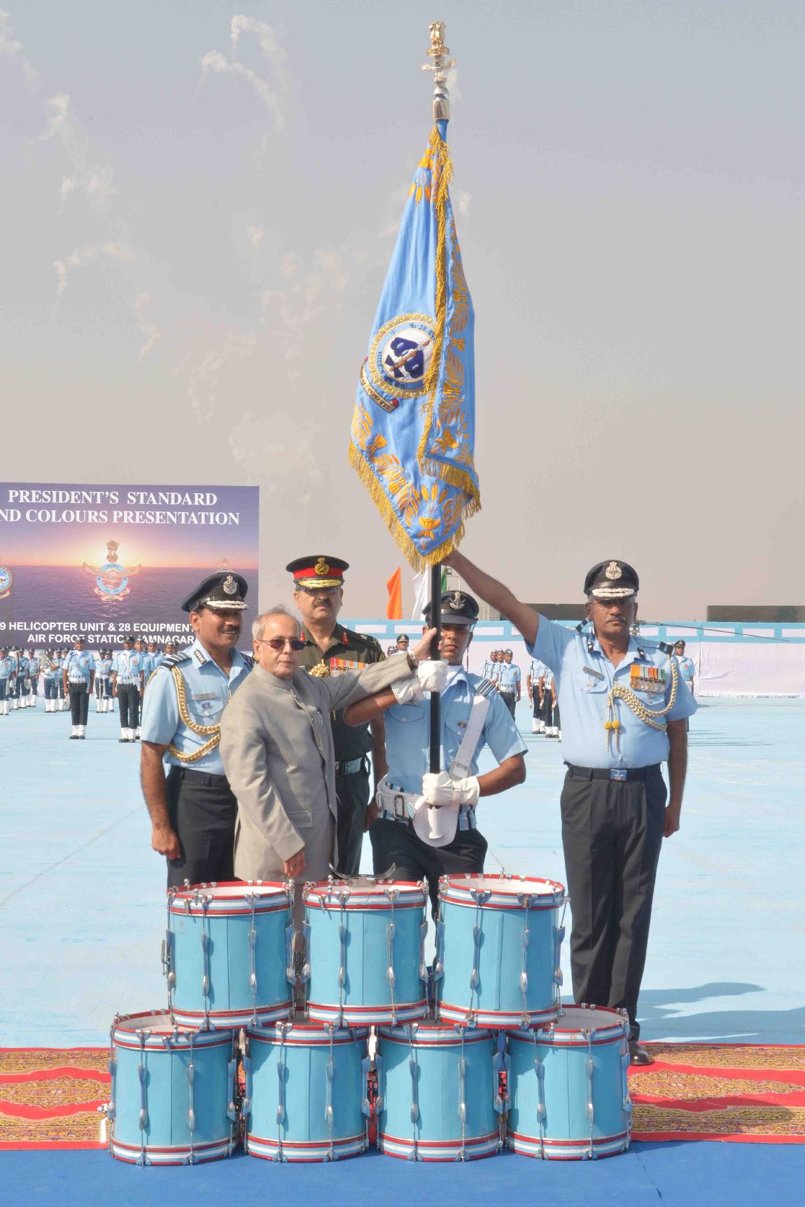 | Caption: | The President of India, Shri Pranab Mukherjee presenting the Standard to 119 Helicopter Unit and Colours to 28 Equipment Depot of Indian Air Force, at Jamnagar, Gujarat on March 04, 2016. |