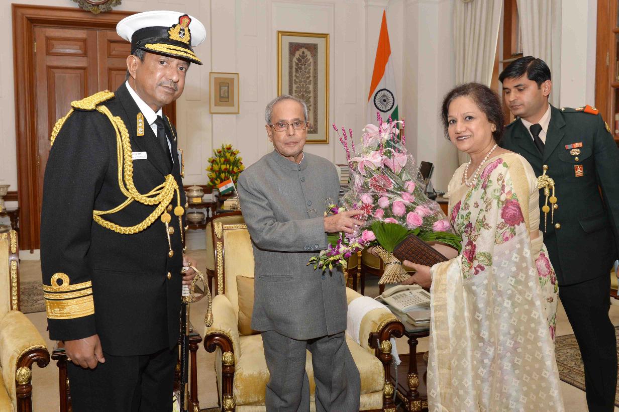 | Caption: | The President of India, Shri Pranab Mukherjee meeting with Vice Admiral Pradeep K. Chatterjee, Commanding -in-Chief, Andaman & Nicobar Command & Hony ADC to the President alongwith his wife Smt. Sharmistha Chatterjee from Port Blair, at Rashtrapati Bhavan on February 25, 2016. |