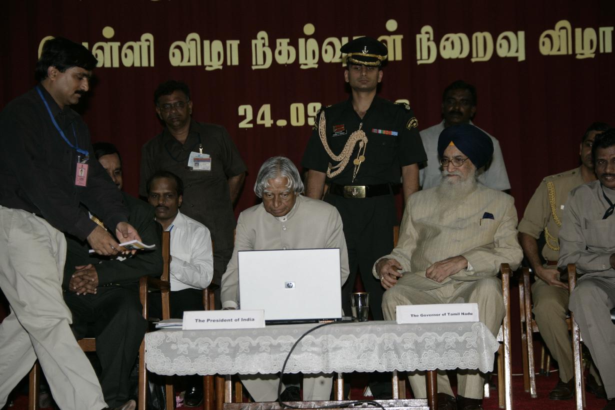 | Caption: | The President of India, Dr A P J Abdul Kalam visiting the Tamil University and launches the University's website at Thanjavur in Tamil Nadu on Sep 24, 2006 |