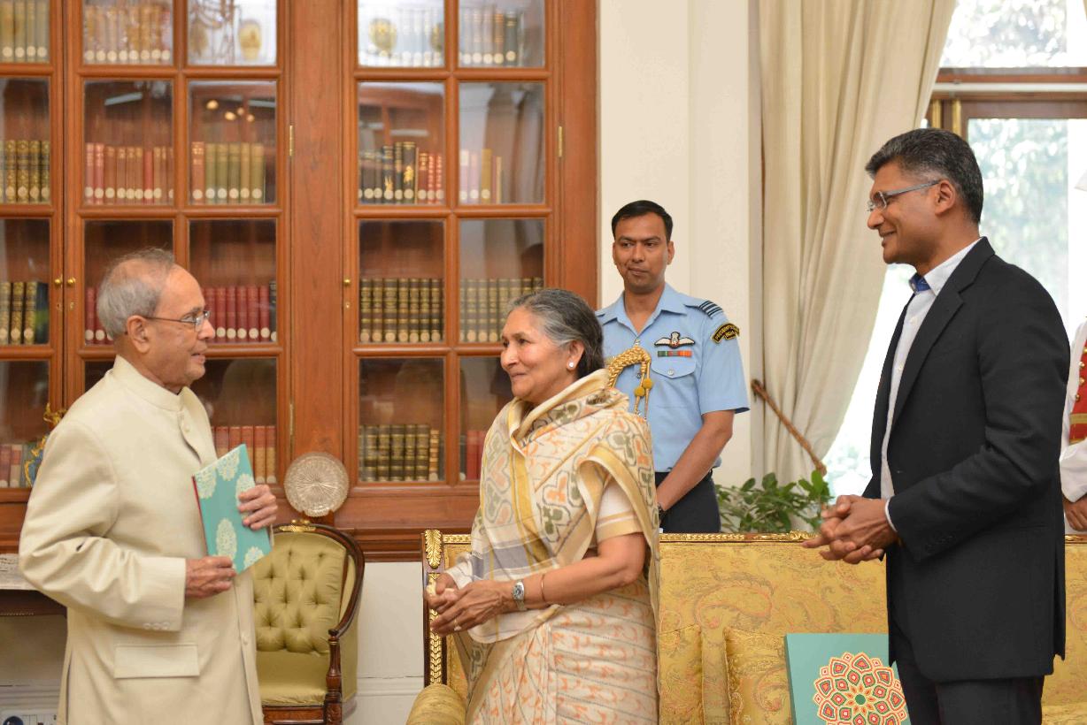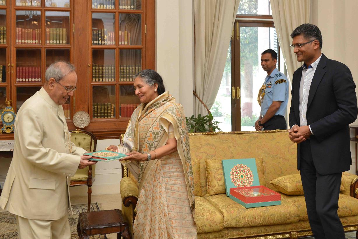 | Caption: | The President of India, Shri Pranab Mukherjee meeting with Smt. Savitri Jindal, Chairperson Emeritus, OP Jindal Group alongwith her son Shri Rattan Jindal, at Rashtrapati Bhavan on March 02, 2016. |