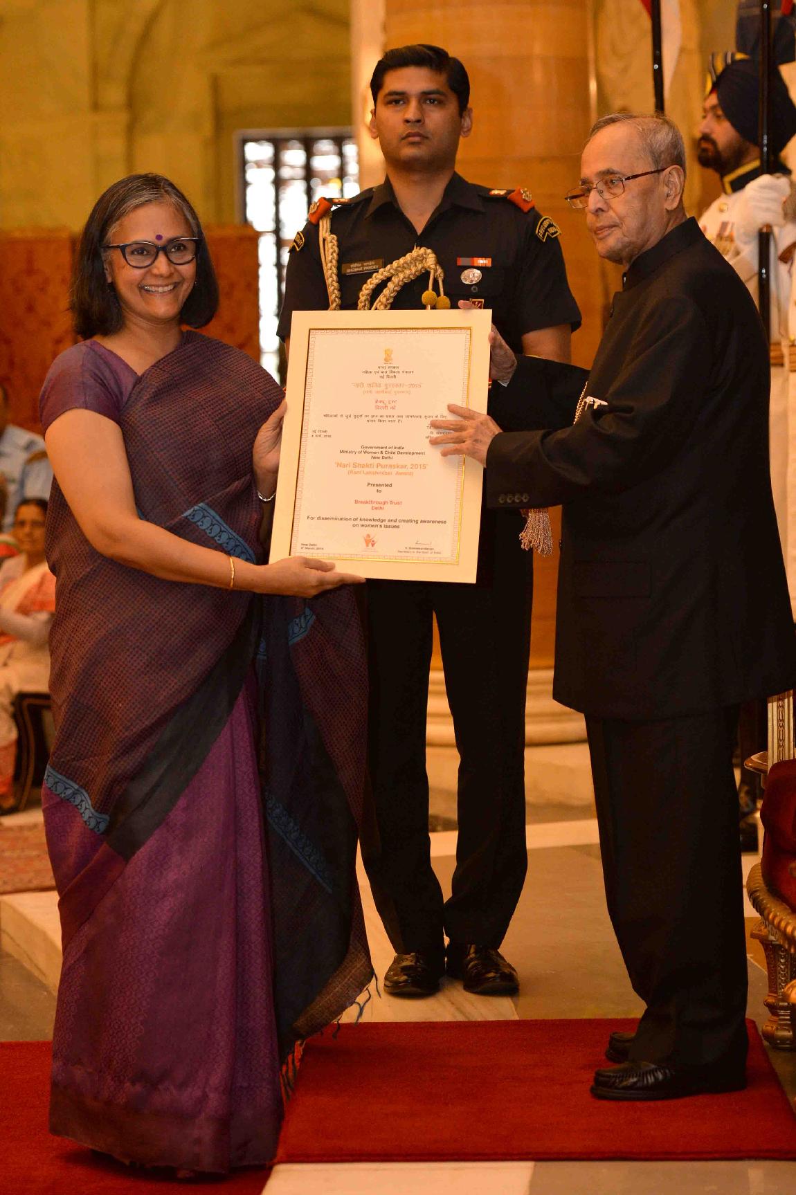 | Caption: | The President of India, Shri Pranab Mukherjee presenting the Nari Shakti Puraskar 2015 (Rani Lakshmibai Award) to Technology, Information, Forecasting & Assessment Council (TIFAC), Department of Science & Technology, New Delhi and Breakthrough Trust, Delhi, on the occasion of the International Women s Day, at Rashtrapati Bhavan on March 08, 2016. |