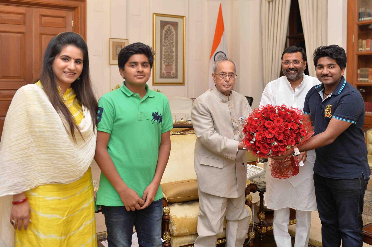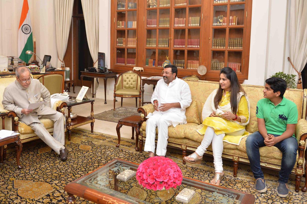 | Caption: | The President of India, Shri Pranab Mukherjee meeting with Smt. & Shri Nishikant Dubey, MP (LS) alongwith their sons Kanishkkant and Maahinkant, at Rashtrapati Bhavan on March 15, 2016. |