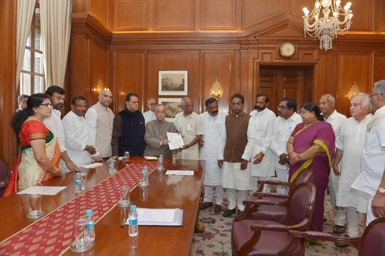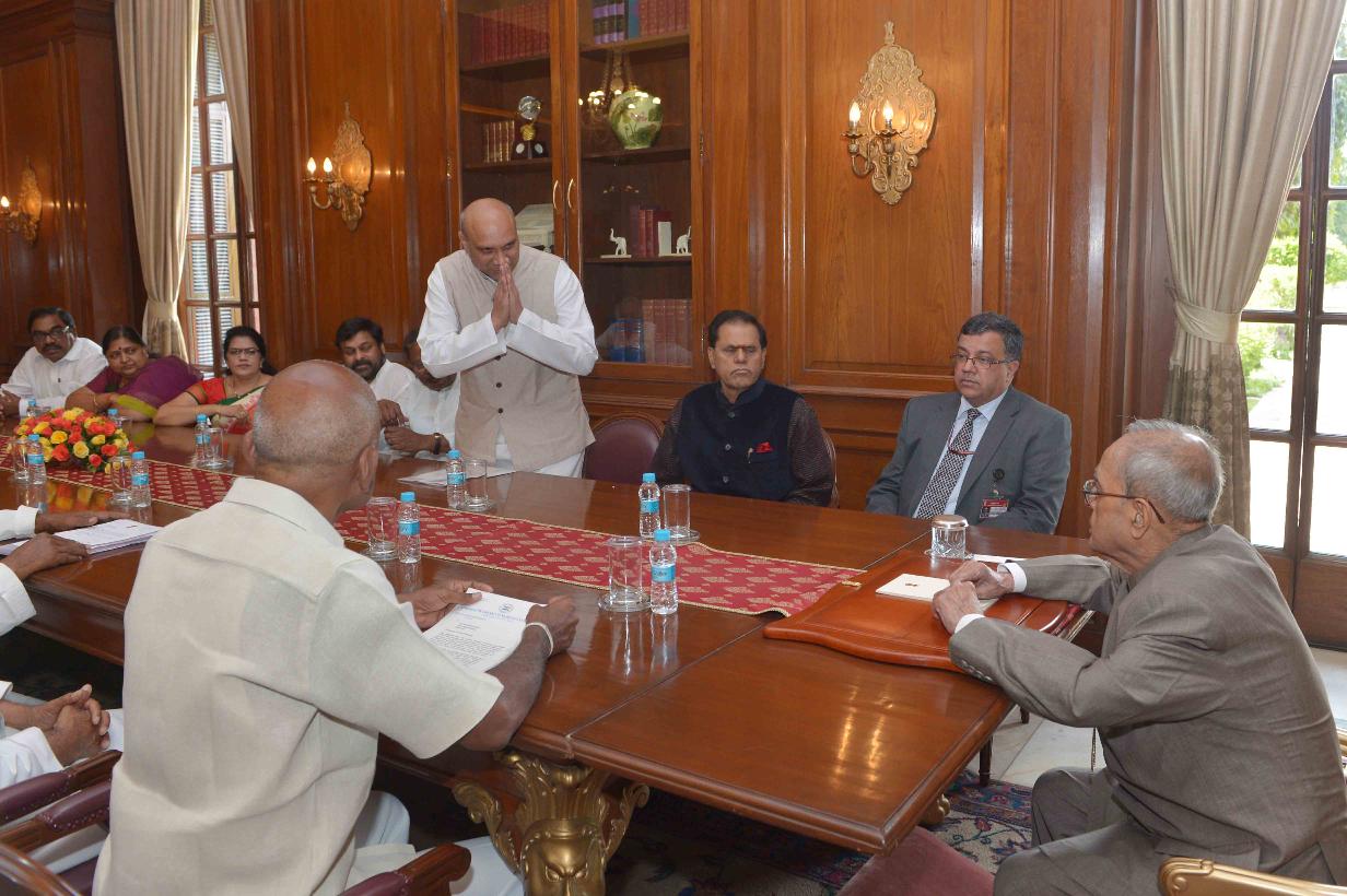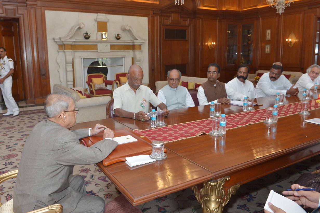 | Caption: | The President of India, Shri Pranab Mukherjee meeting with Shri Digvijay Singh, MP (RS) alongwith a delegation of Andhra Pradesh Congress Committee, at Rashtrapati Bhavan on March 14, 2016. |