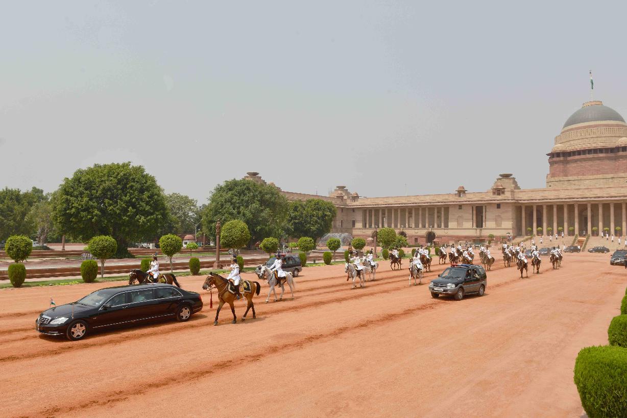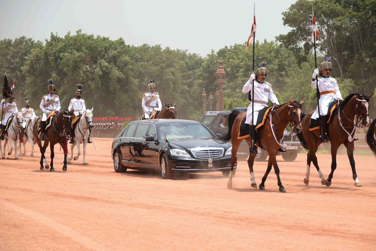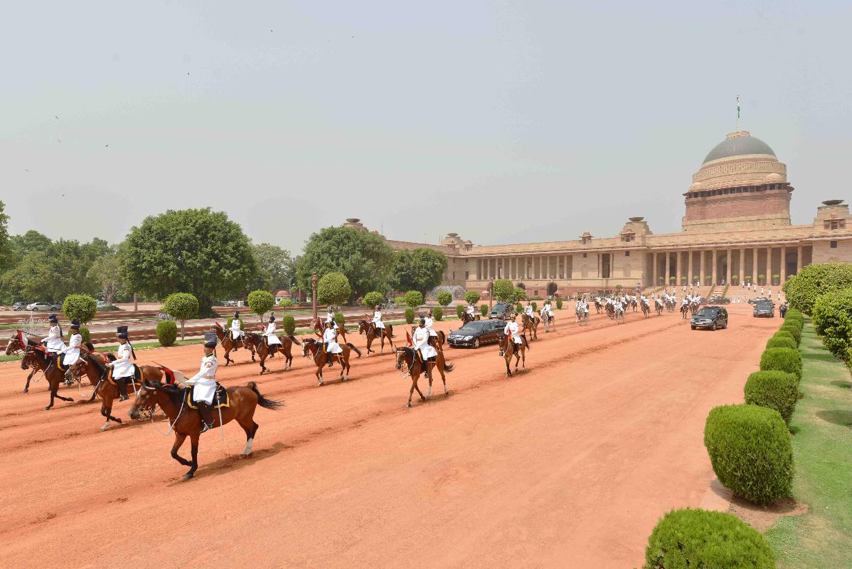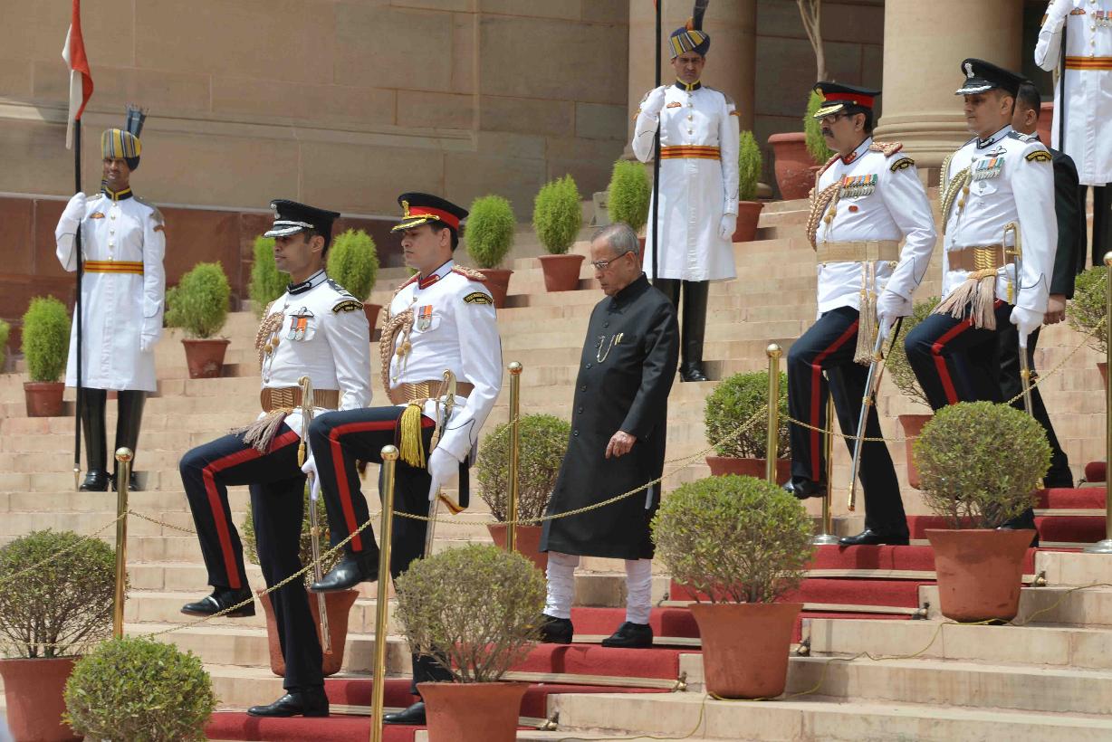 | Caption: | The President's Body Guard (PBG) presenting the National Salute to the President of India, Shri Pranab Mukherjee before leaving for Central Hall of Parliament to delivering his address to both the Houses of Parliament at the Forecourt of Rashtrapati Bhavan in New Delhi on June 09, 2014 |