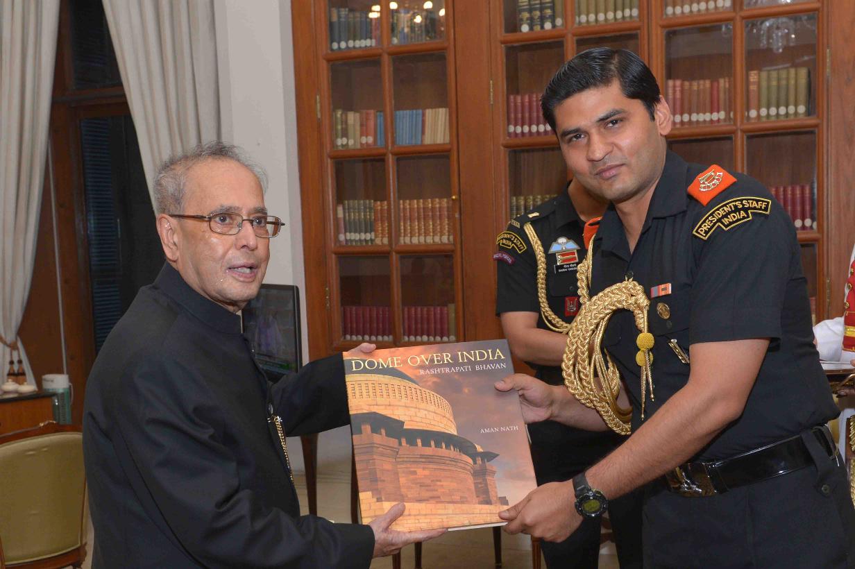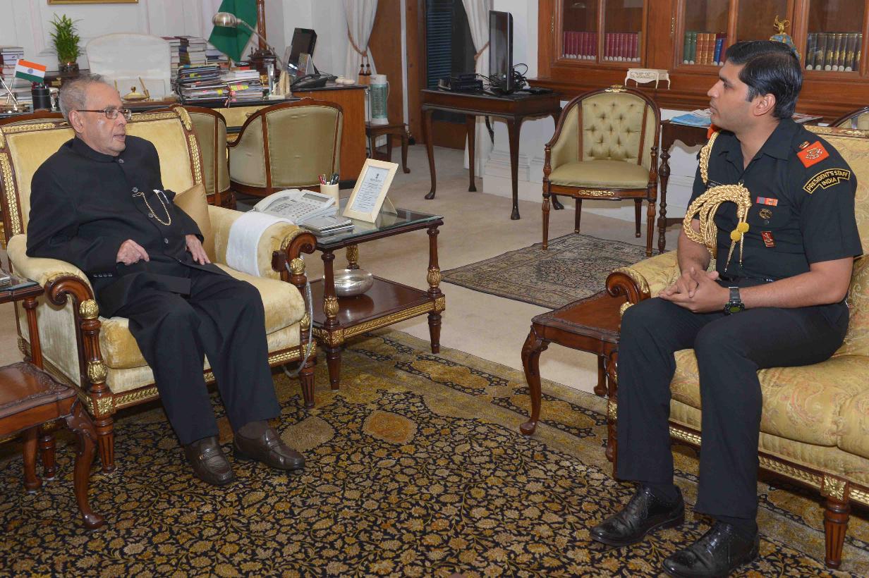 | Caption: | The President of India, Shri Pranab Mukherjee meeting with Major Shobhit Pandey, ADC to the President, during farewell call, at Rashtrapati Bhavan on March 14, 2016. |