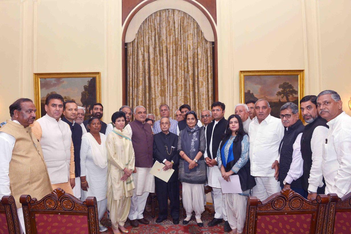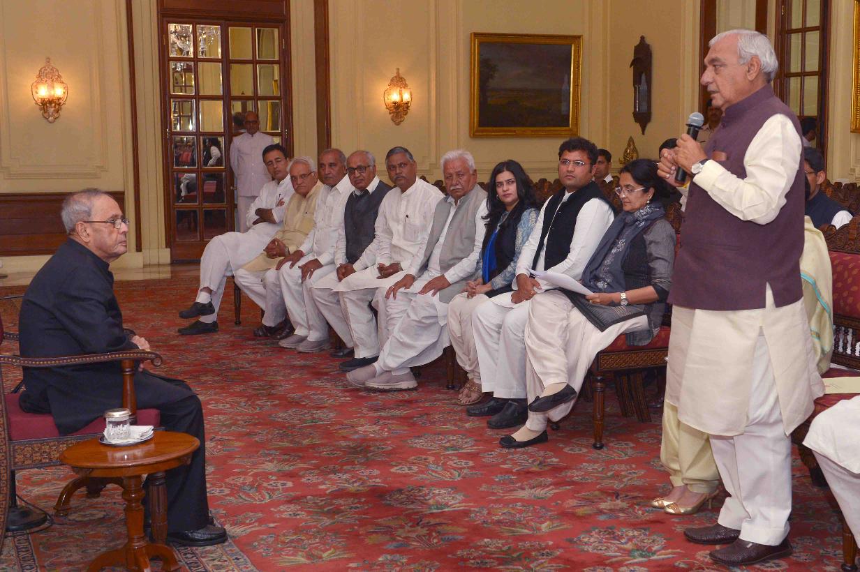 | Caption: | The President of India, Shri Pranab Mukherjee meeting with Shri Bhupinder Singh Hooda, former Chief Minister of Haryana alongwith a delegation of MLAs from Haryana, at Rashtrapati Bhavan on March 17, 2016. |