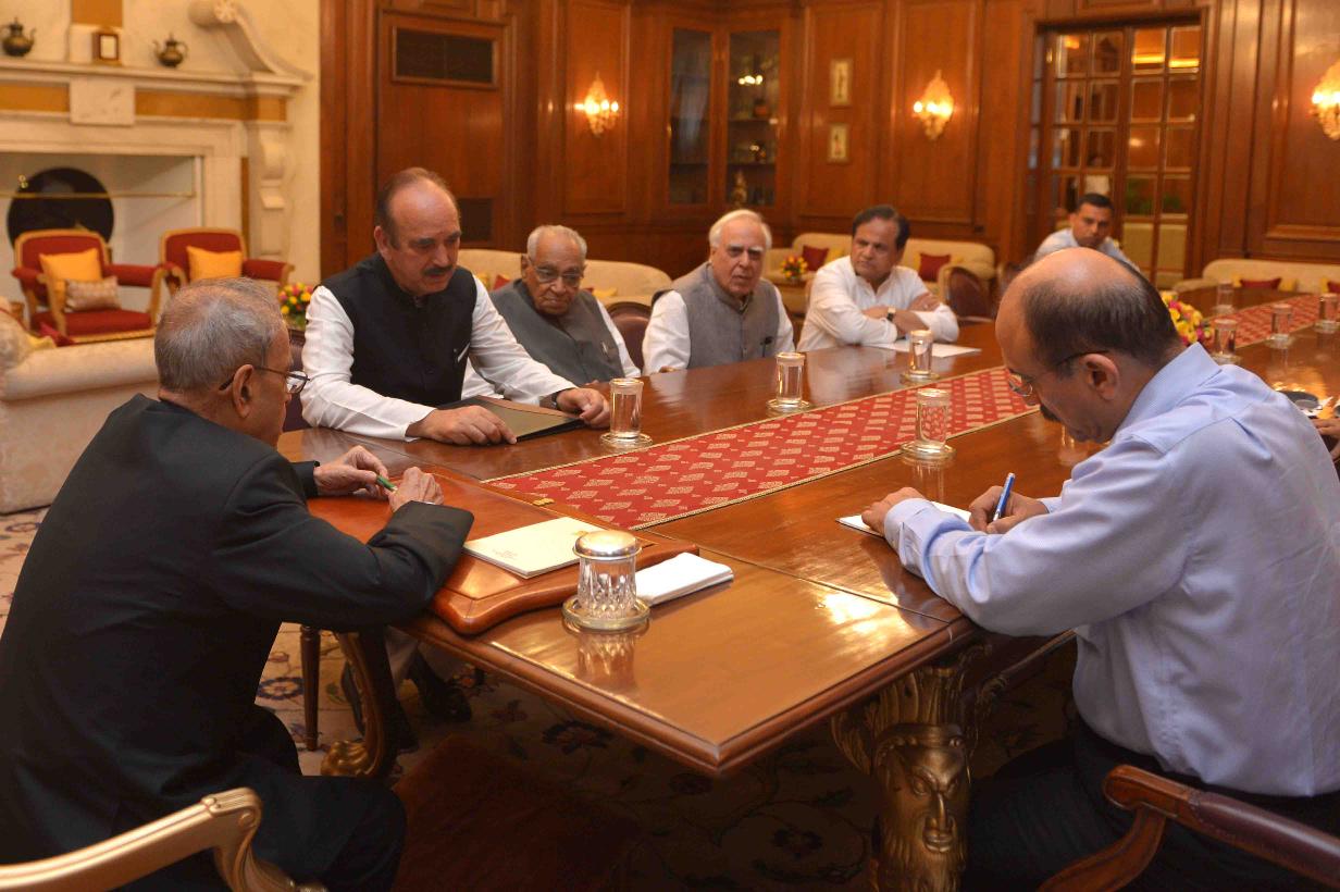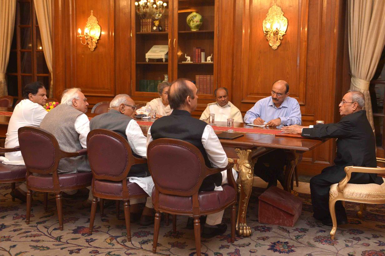 | Caption: | The President of India, Shri Pranab Mukherjee meeting with Shri Ghulam Nabi Azad, Leader of Opposition, Rajya Sabha, Shri Ahmad Patel, MP (RS), Smt. Ambika Soni, MP (RS), Shri Moti Lal Vohra, Shri AK Antony and Shri Kapil Sibal, at Rashtrapati Bhavan on March 21, 2016. |