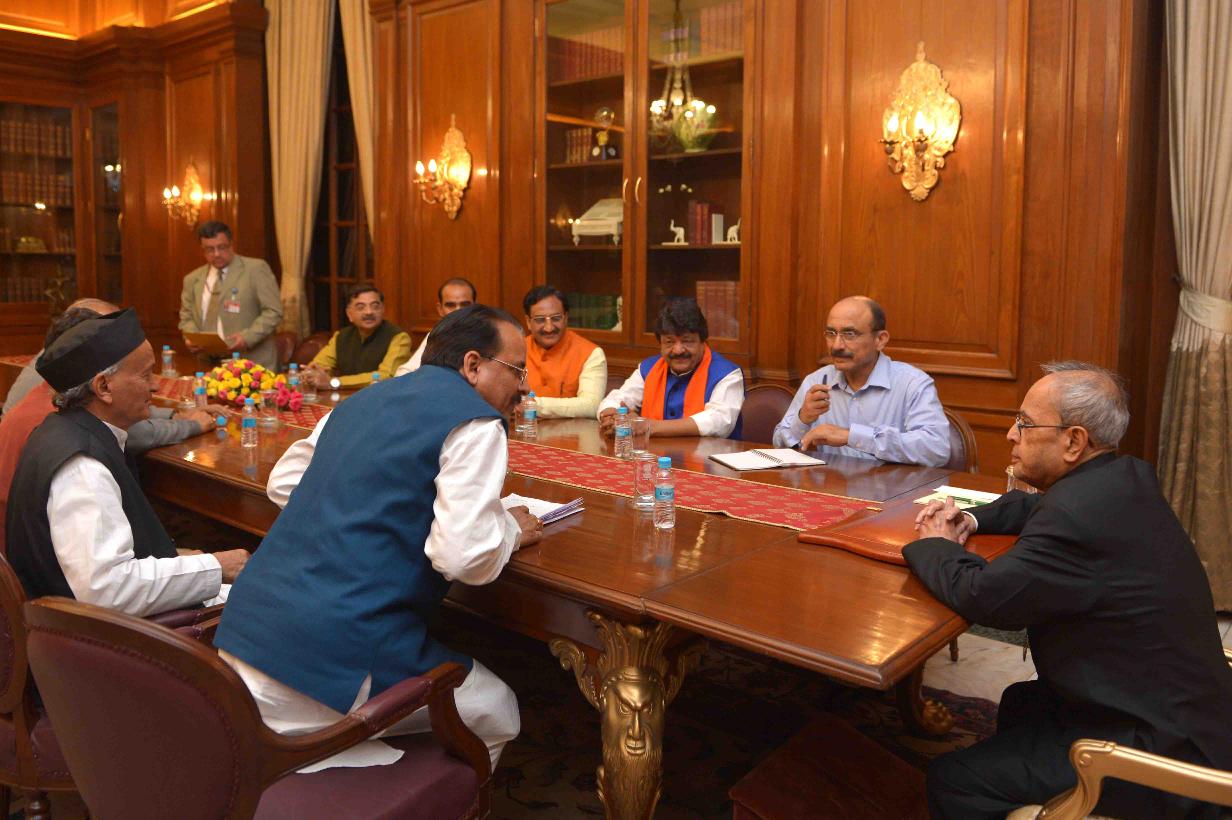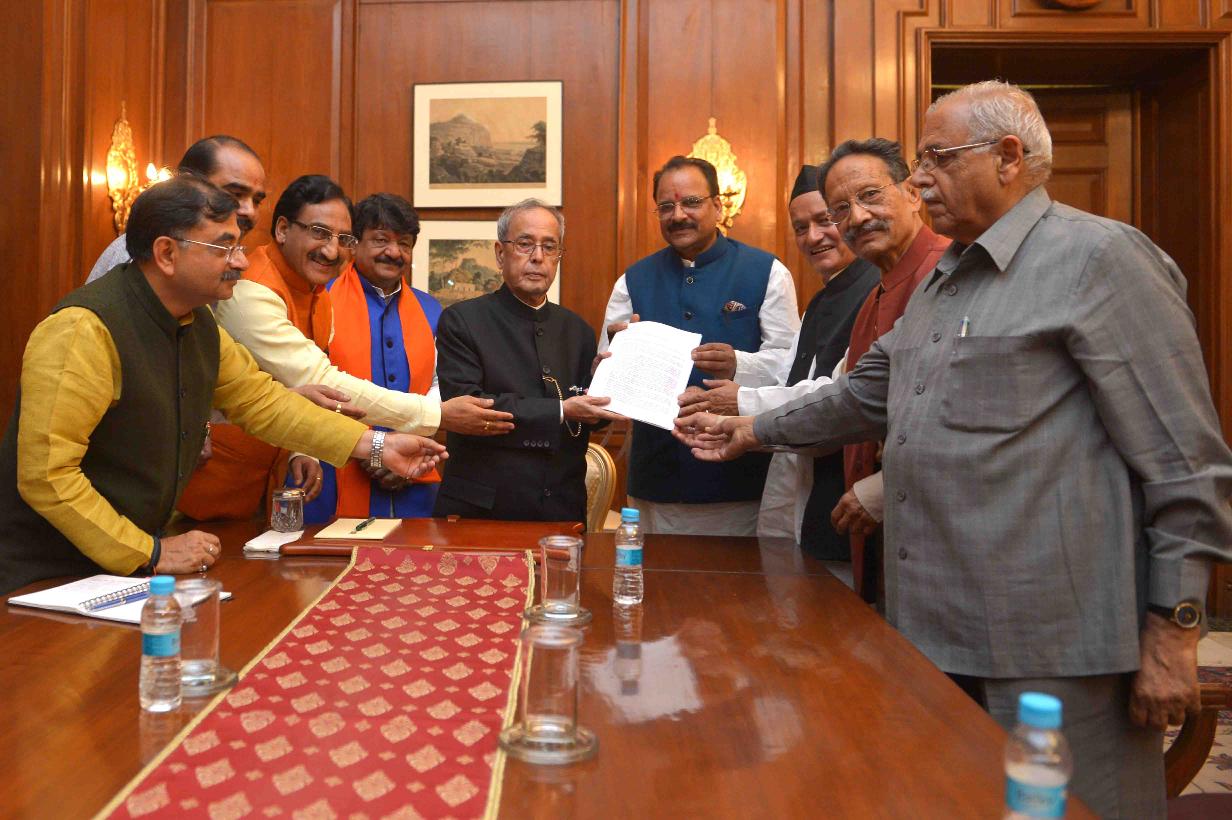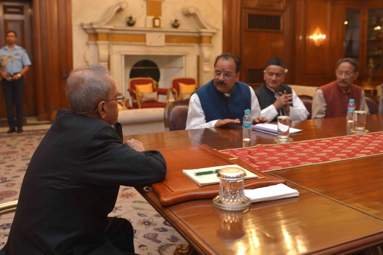 | Caption: | The President of India, Shri Pranab Mukherjee meeting with a delegation of BJP MPs & MLAs from Bhartiya Janata Party & Congress from Uttarakhand led by Shri Ajay Bhatt, Leader of Opposition, Uttarakhand Legislative Assembly, at Rashtrapati Bhavan on March 21, 2016. |