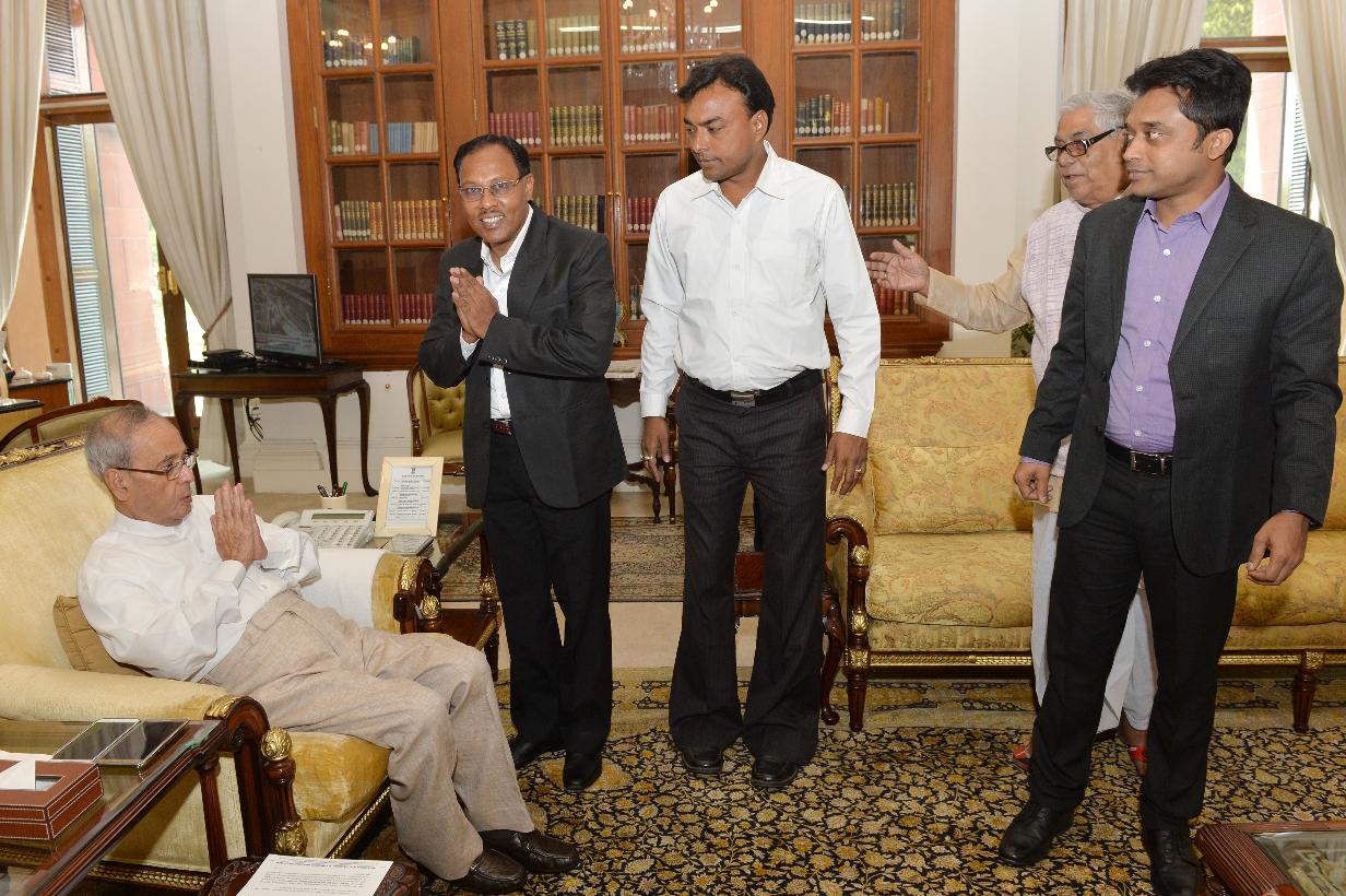 | Caption: | The President of India, Shri Pranab Mukherjee meeting with Shri Dwijaprasad Bhattacharya with others, at Rashtrapati Bhavan on March 31, 2016. |