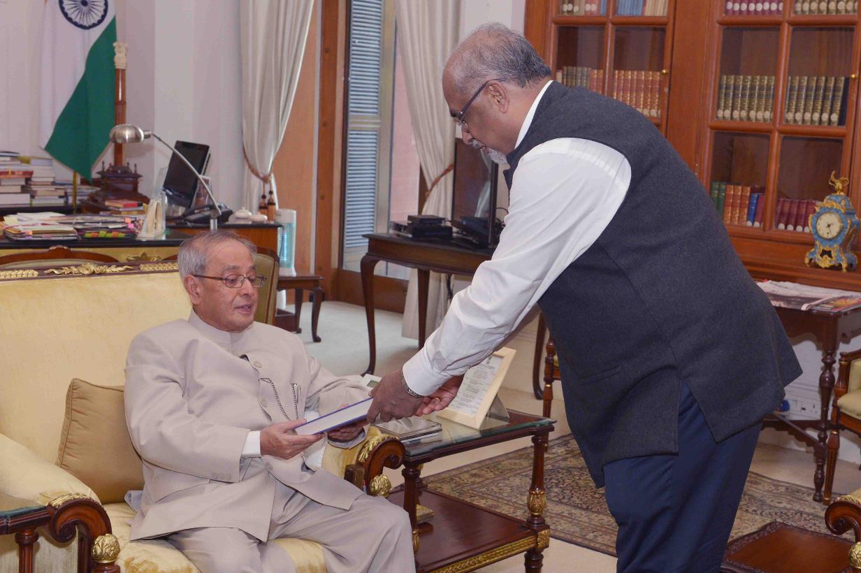 | Caption: | The President of India, Shri Pranab Mukherjee receives a book 'The Turn of the Tortoise' from Shri T.N. Ninan, at Rashtrapati Bhavan, in New Delhi on October 26, 2015. |
