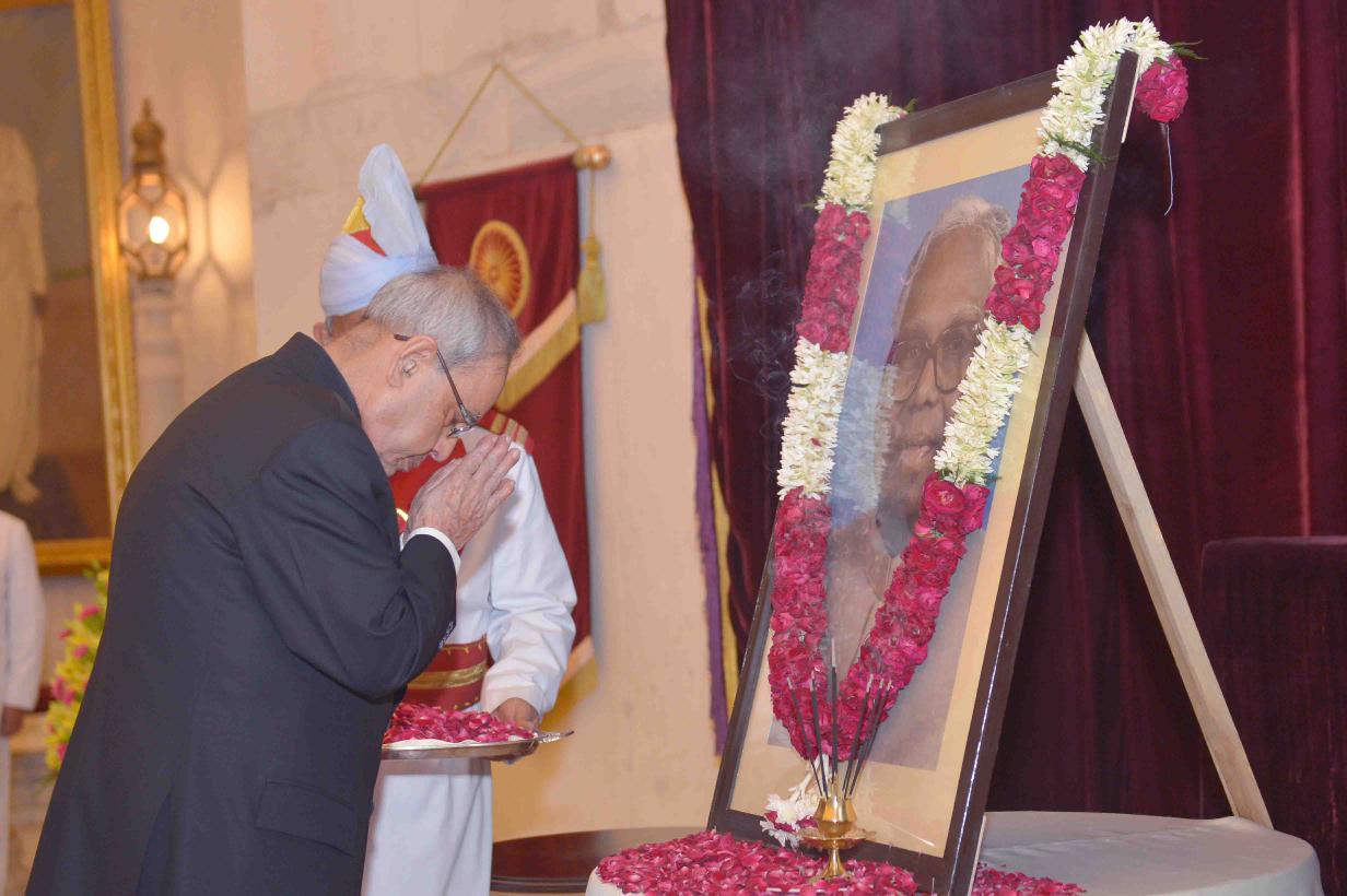 | Caption: | The President of India, Shri Pranab Mukherjee paying floral tributes at the portrait of the former President of India, Shri K.R.Narayanan on his Birth Anniversary at Rashtrapati Bhavan on October 27, 2015. |