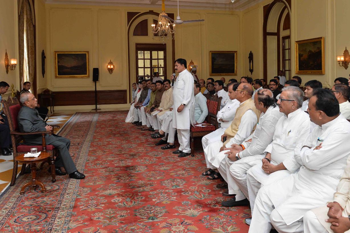 | Caption: | The President of India, Shri Pranab Mukherjee meeting wih the delegation from Gujarat Pradesh Congress Committee led by Shri Bharatsinh Solanki and Shri Shankersinh Vaghela, Leader of Opposition,Gujarat Legislative Assembly, at Rashtrapati Bhavan, in New Delhi on October 03, 2015. |