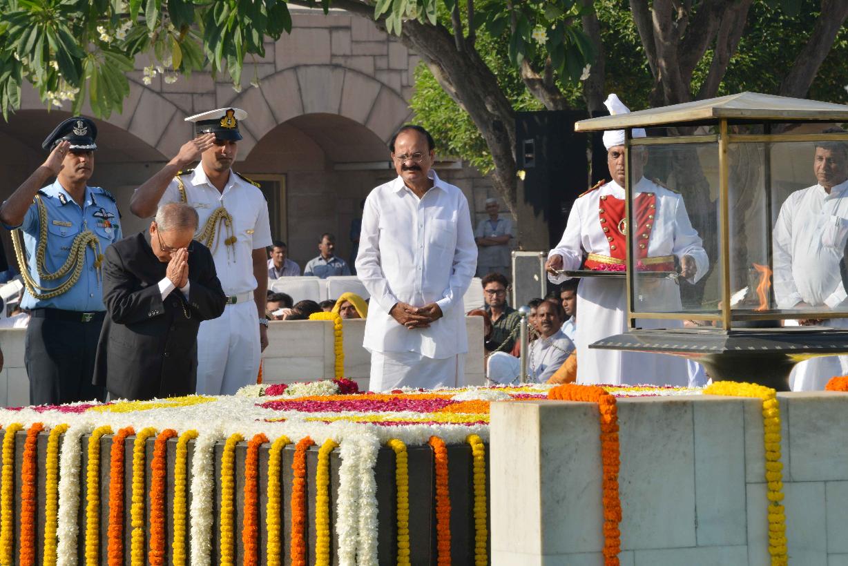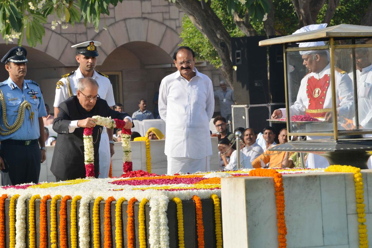 | Caption: | The President of India, Shri Pranab Mukherjee paying floral tributes at the Samadhi of Mahatma Gandhi on the occasion of his 146th Birth Anniversary, at Rajghat, in Delhi on October 02, 2015 . |