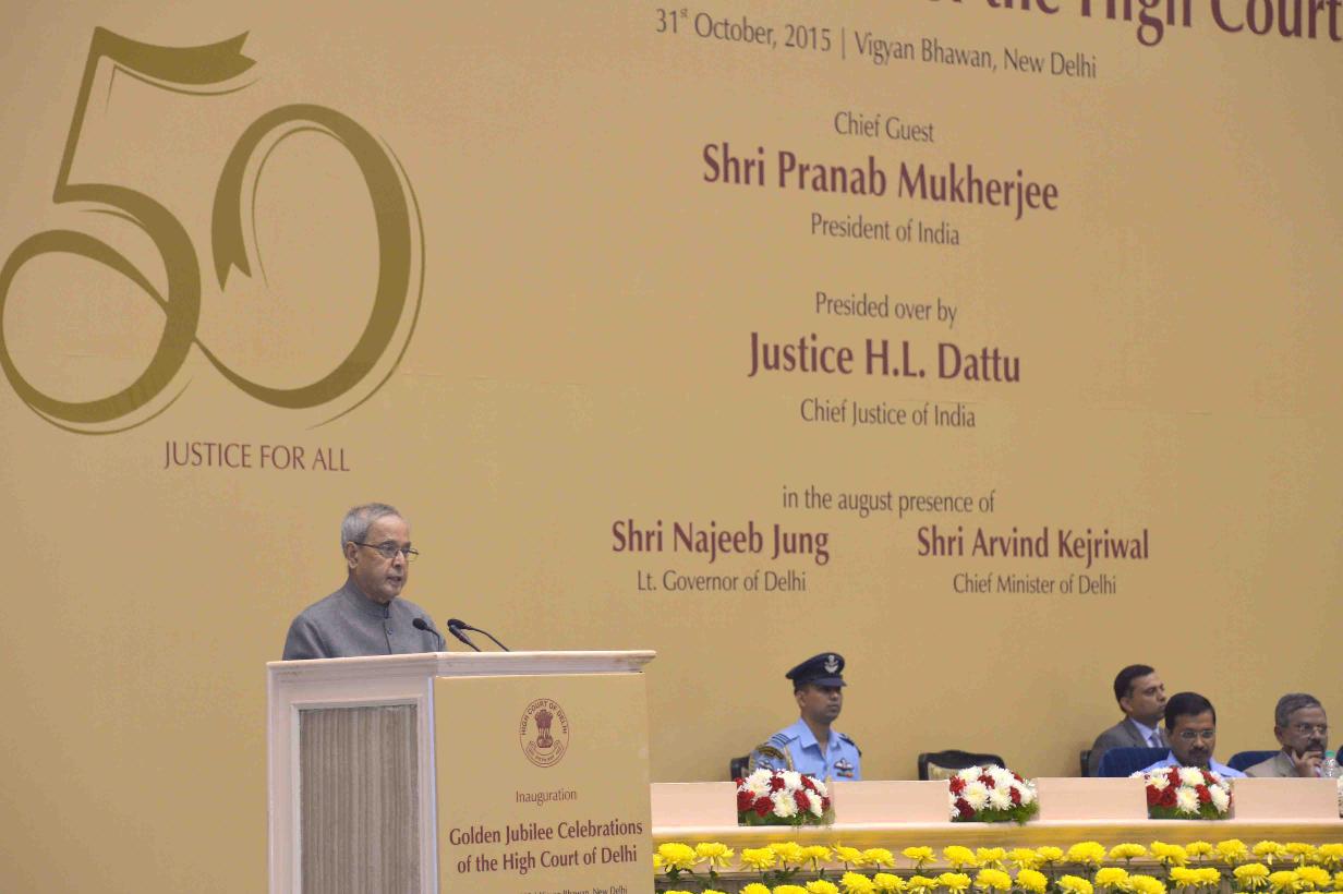| Caption: | The President of India, Shri Pranab Mukherjee addressing at the inauguration of the Golden Jubilee Celebrations of High Court of Delhi, at Vigyan Bhavan, in New Delhi on October 31, 2015. |