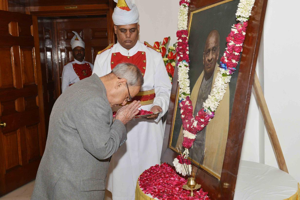 | Caption: | The President of India, Shri Pranab Mukherjee paying floral tributes at the portrait of Sardar Vallabhbhai Patel on his Birth Anniversary, at Rashtrapati Bhavan on October 31, 2015. |