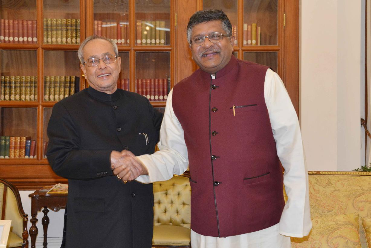 | Caption: | The President of India, Shri Pranab Mukherjee meeting with the Union Minister for Communications & Information Technology, Shri Ravi Shankar Prasad, on the occasion of Diwali, at Rashtrapati Bhavan on November 11, 2015. |