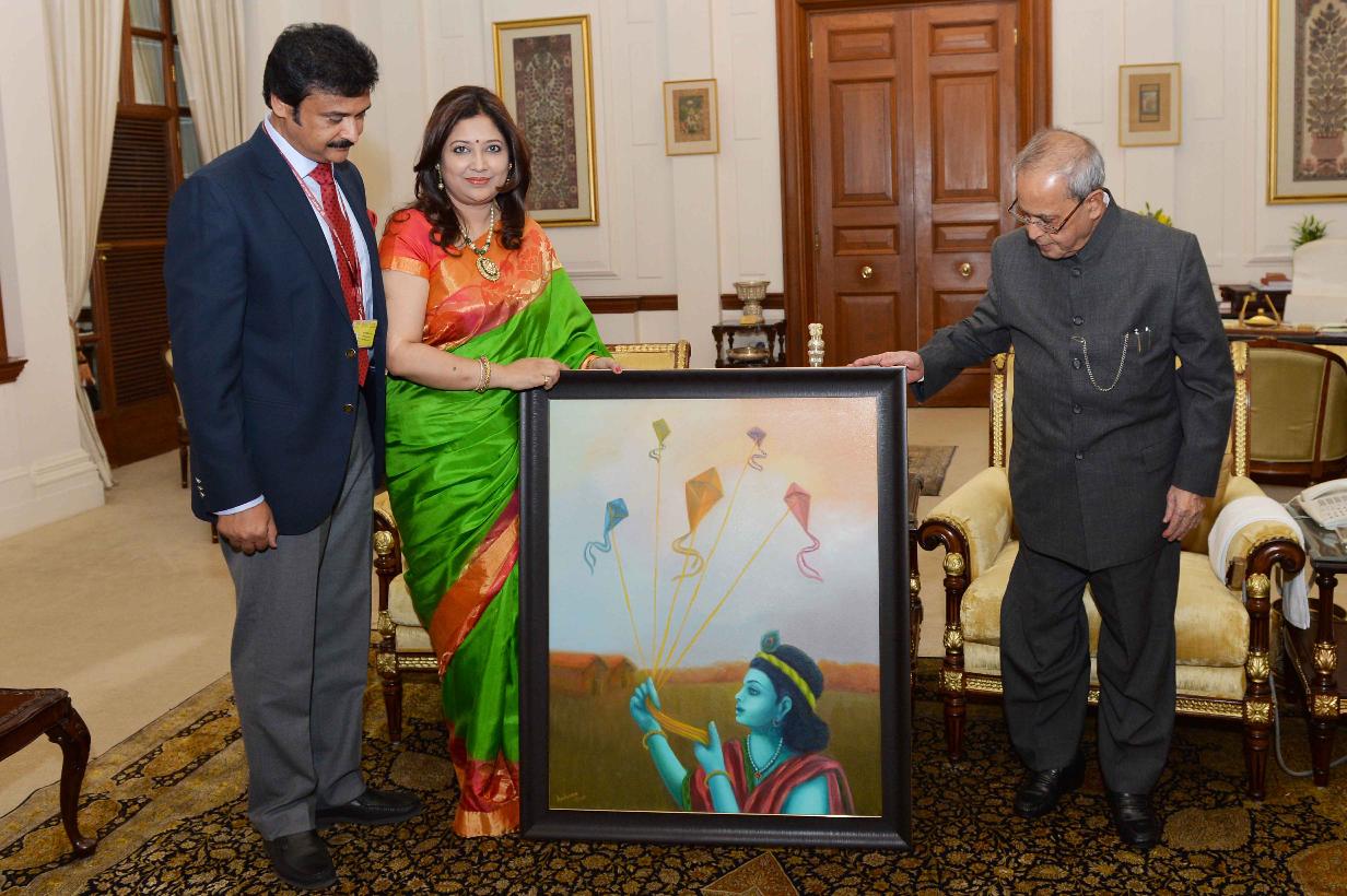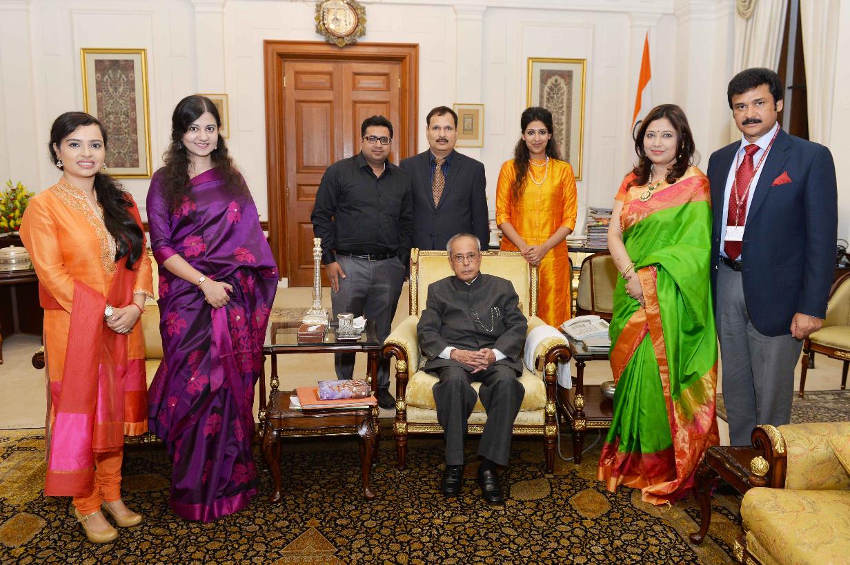 | Caption: | The President of India, Shri Pranab Mukherjee meeting with Dr. Archana Srivastava, Painter with others, at Rashtrapati Bhavan on November 20, 2015. |