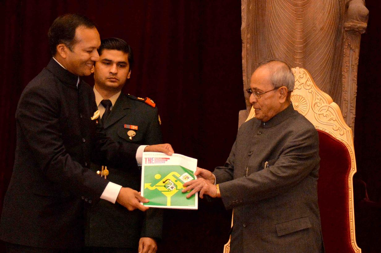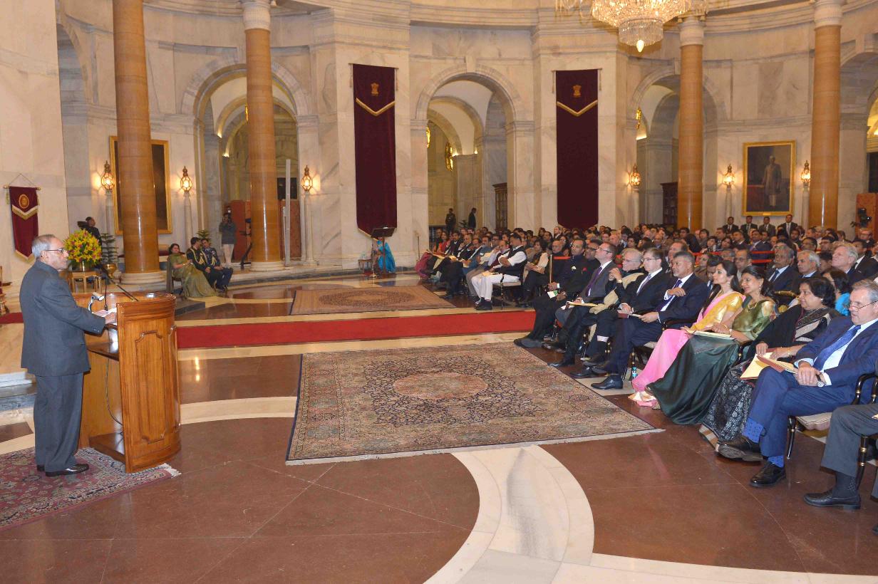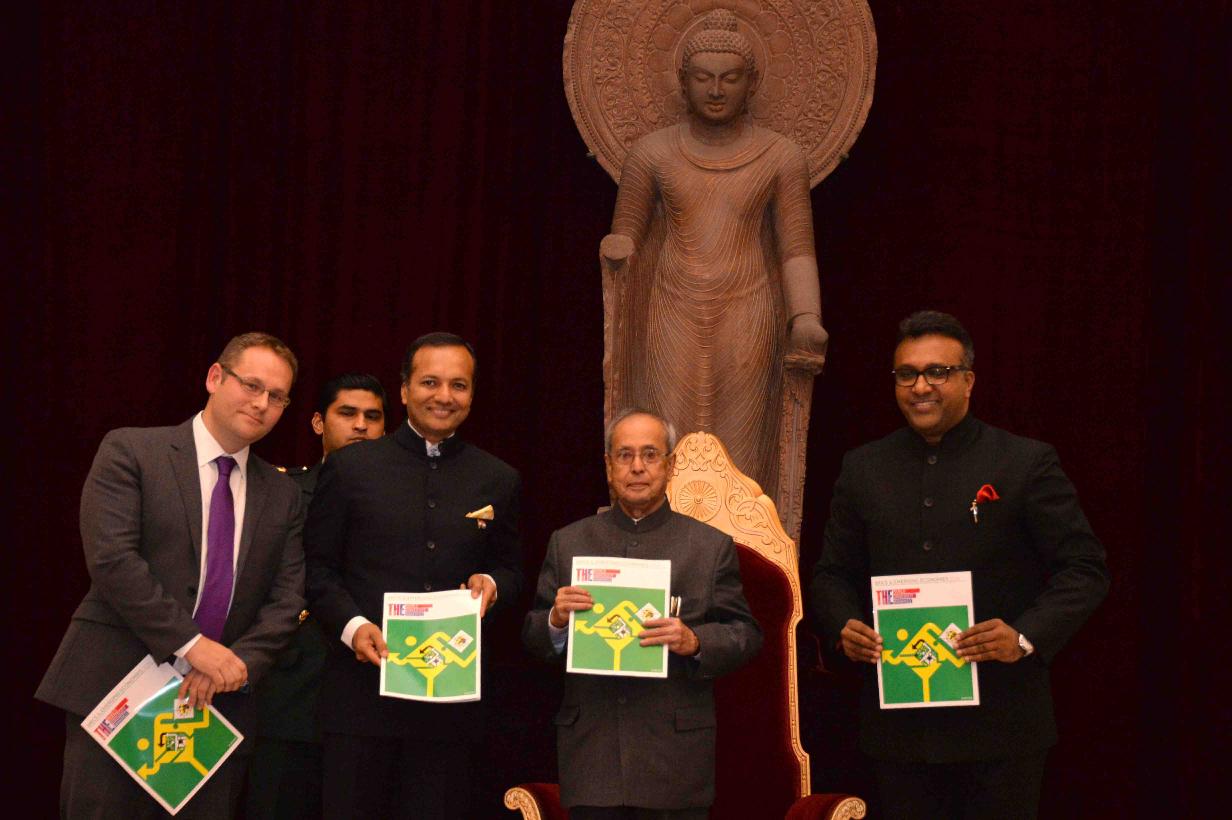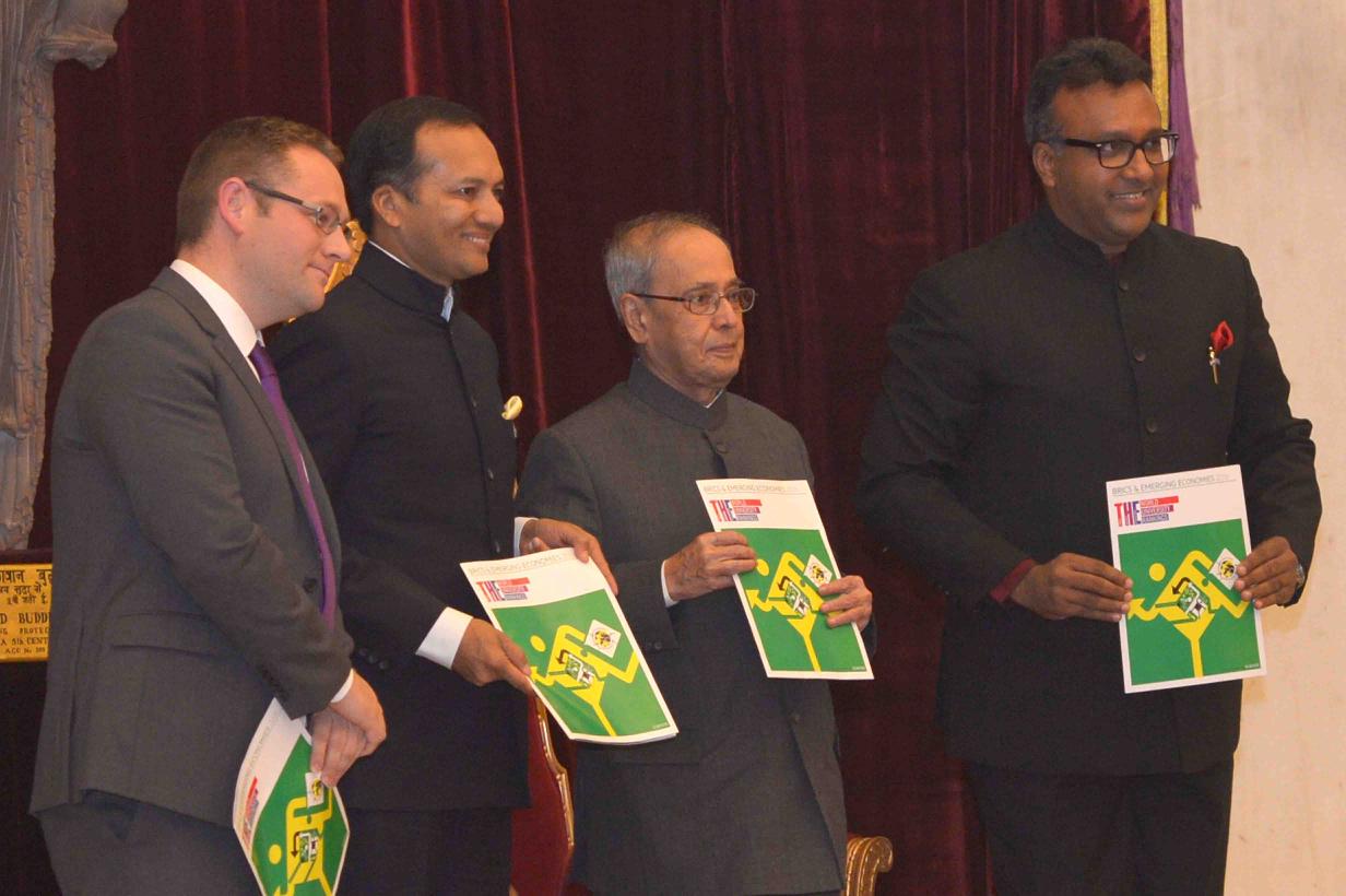 | Caption: | The President of India, Shri Pranab Mukherjee addressing the delegates to the Global Academic Summit and receiving the first copy of the Times Higher Education 'BRICS and Emerging Economies Universities Rankings' at Rashtrapati Bhavan on December 02, 2015. |