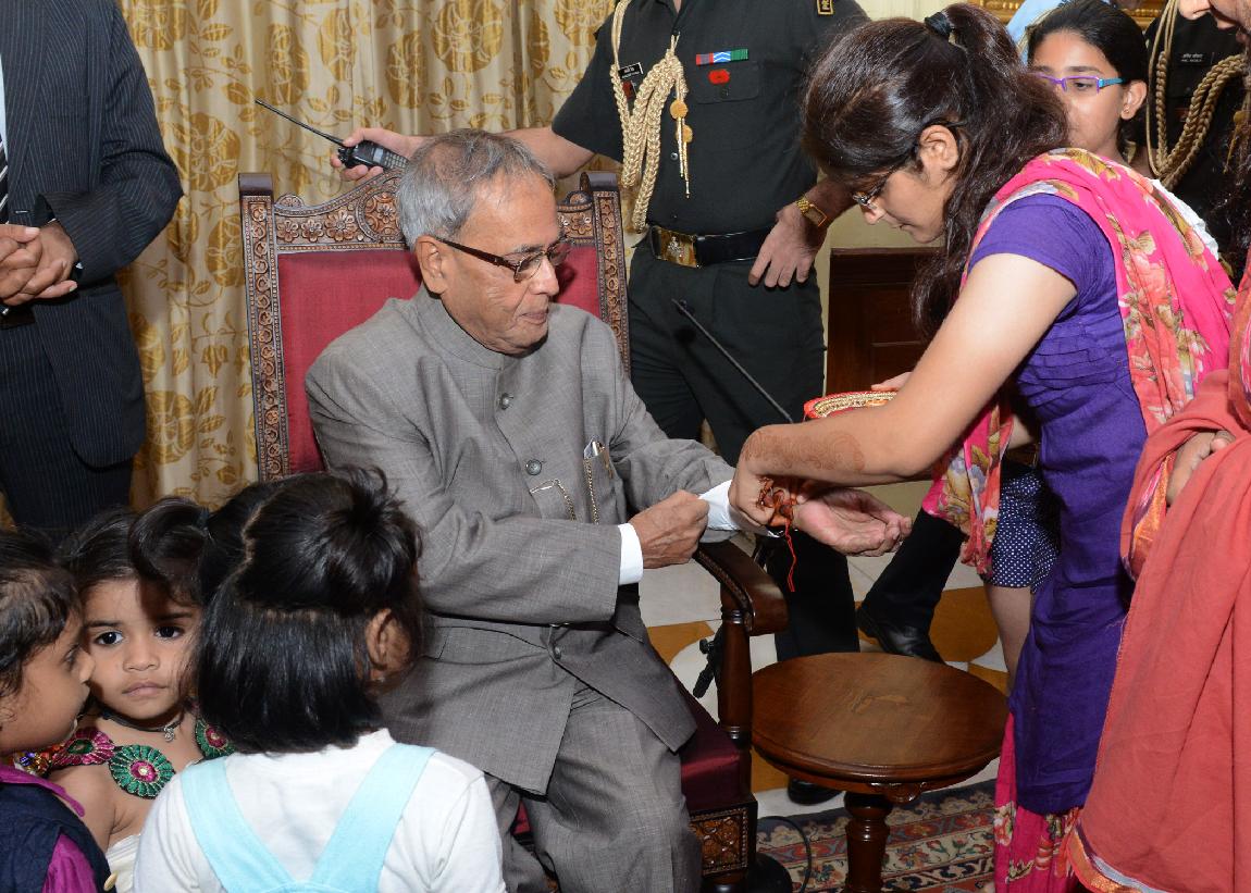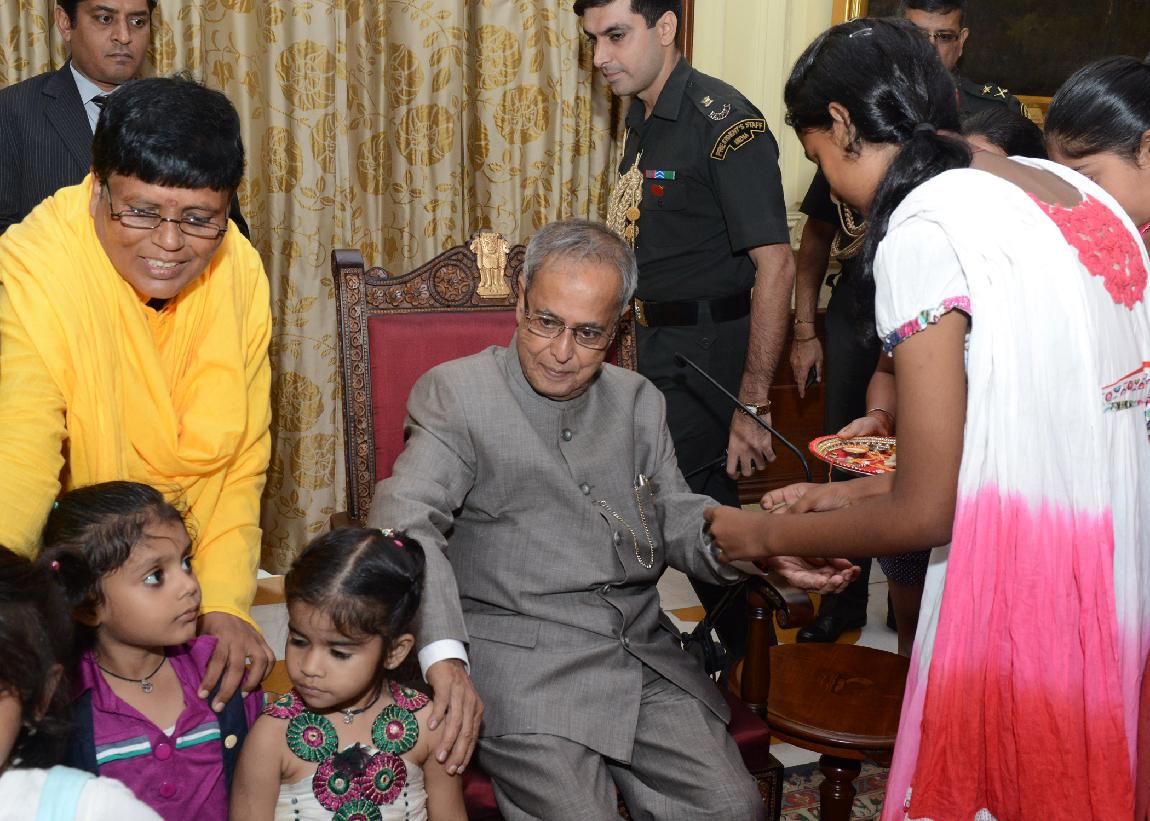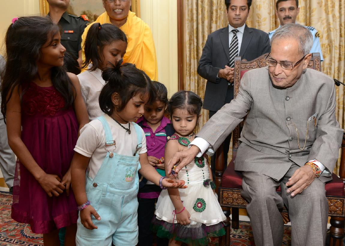 | Caption: | The President of India, Shri Pranab Mukherjee Meeting with the Children from Vatsalya Gram, Param Shaktipeeth Vrindavan on the Occasion of Rakhi at Rashtrapati Bhavan on Aug 24, 2013 |