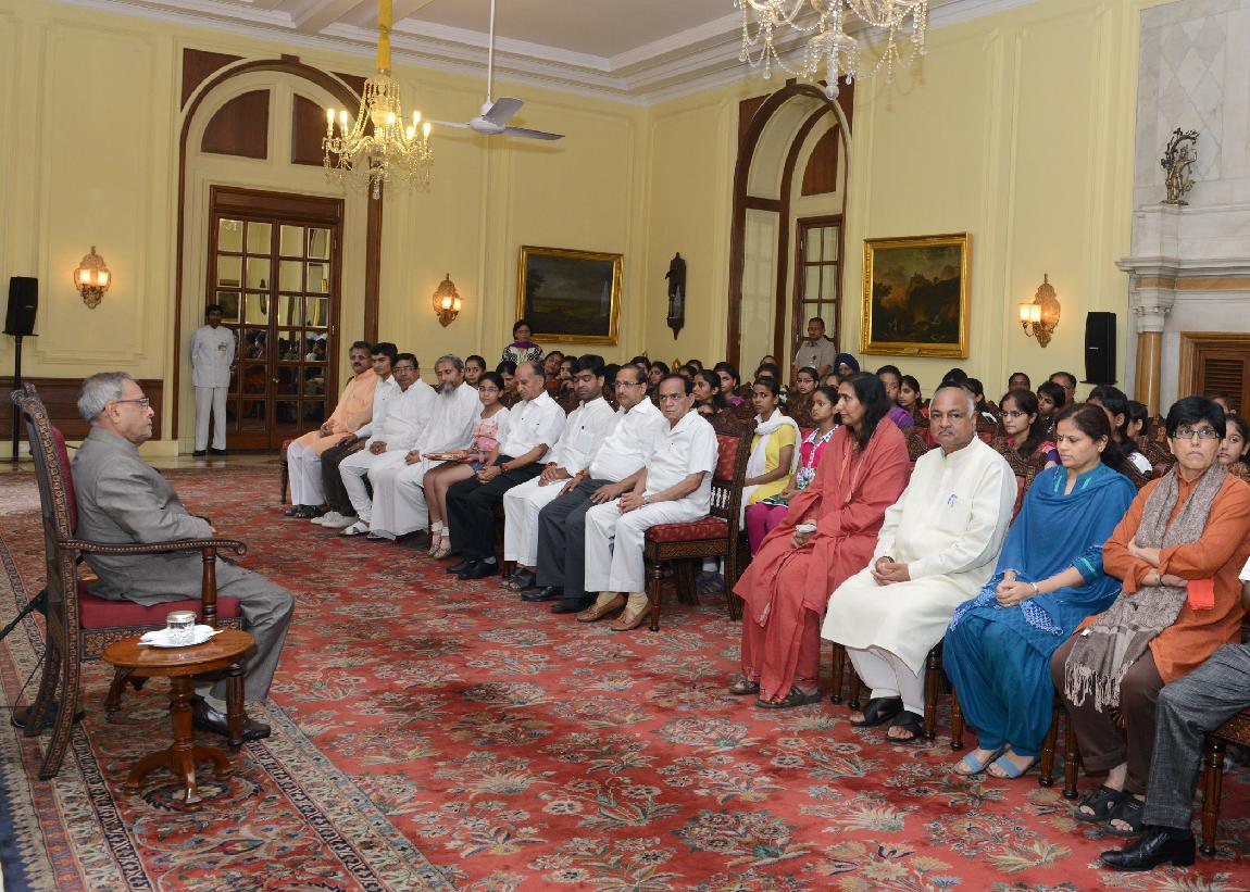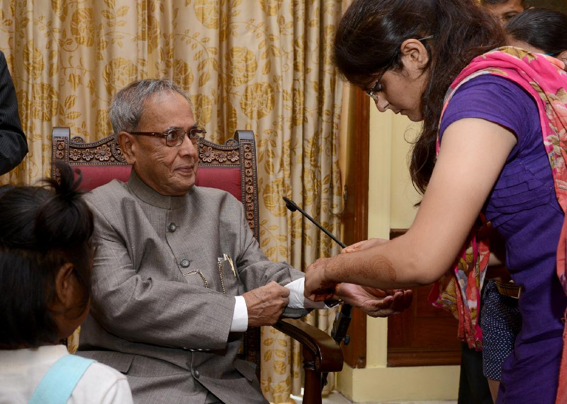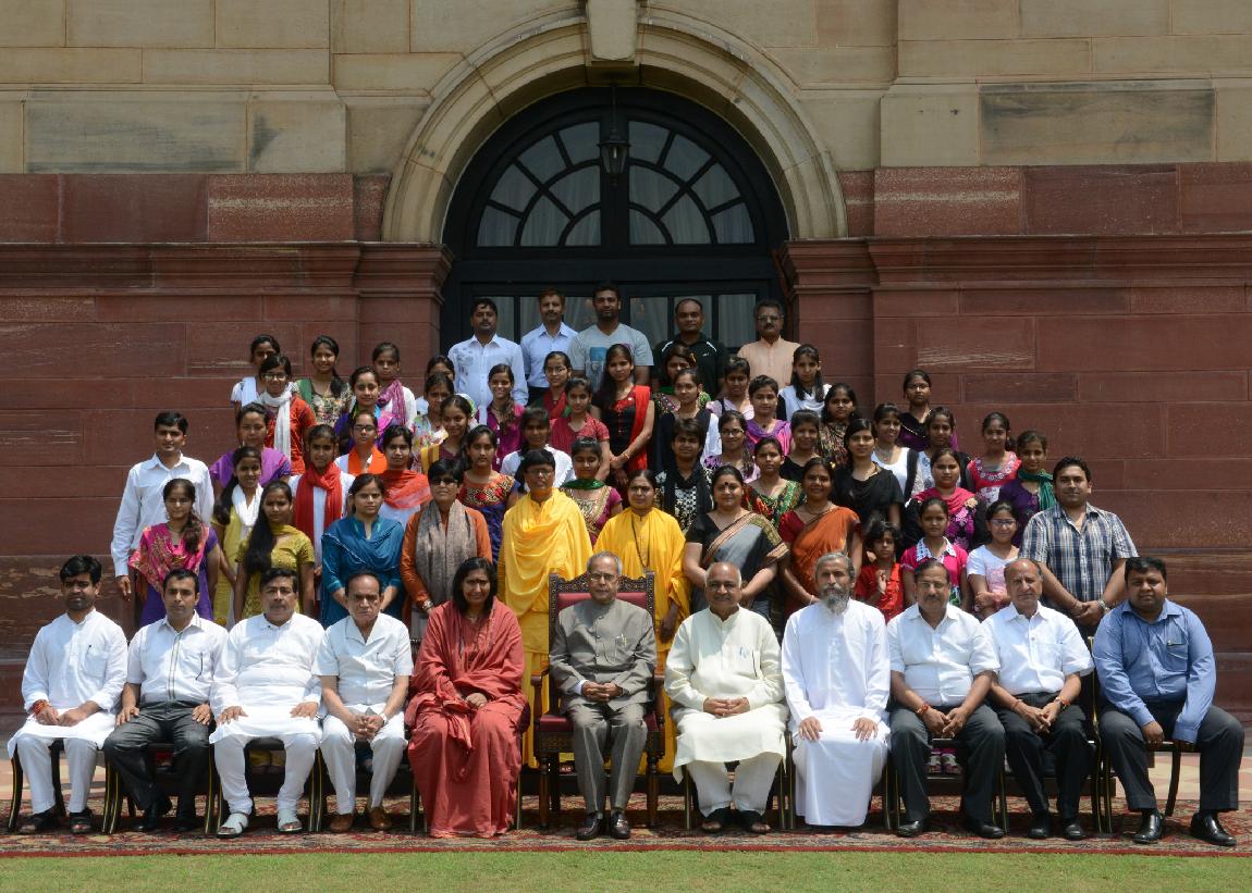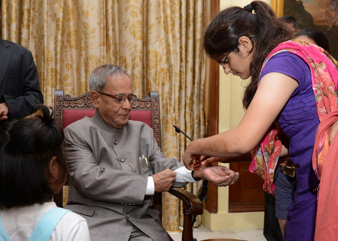 | Caption: | The President of India, Shri Pranab Mukherjee Meeting with the Children from Vatsalya Gram, Param Shaktipeeth Vrindavan on the Occasion of Rakhi at Rashtrapati Bhavan on Aug 24, 2013 |