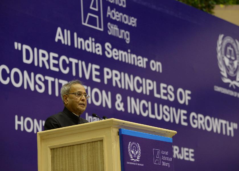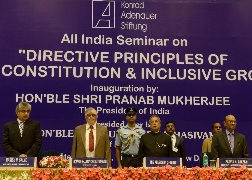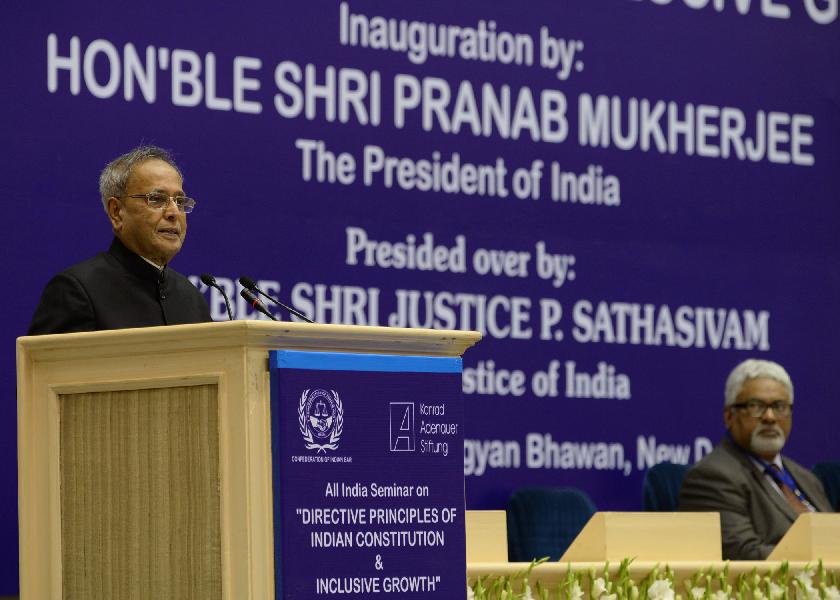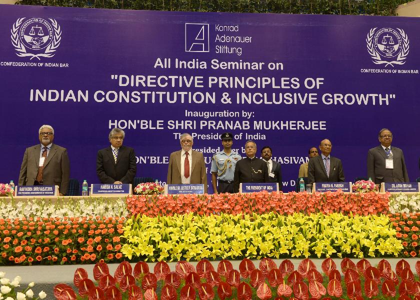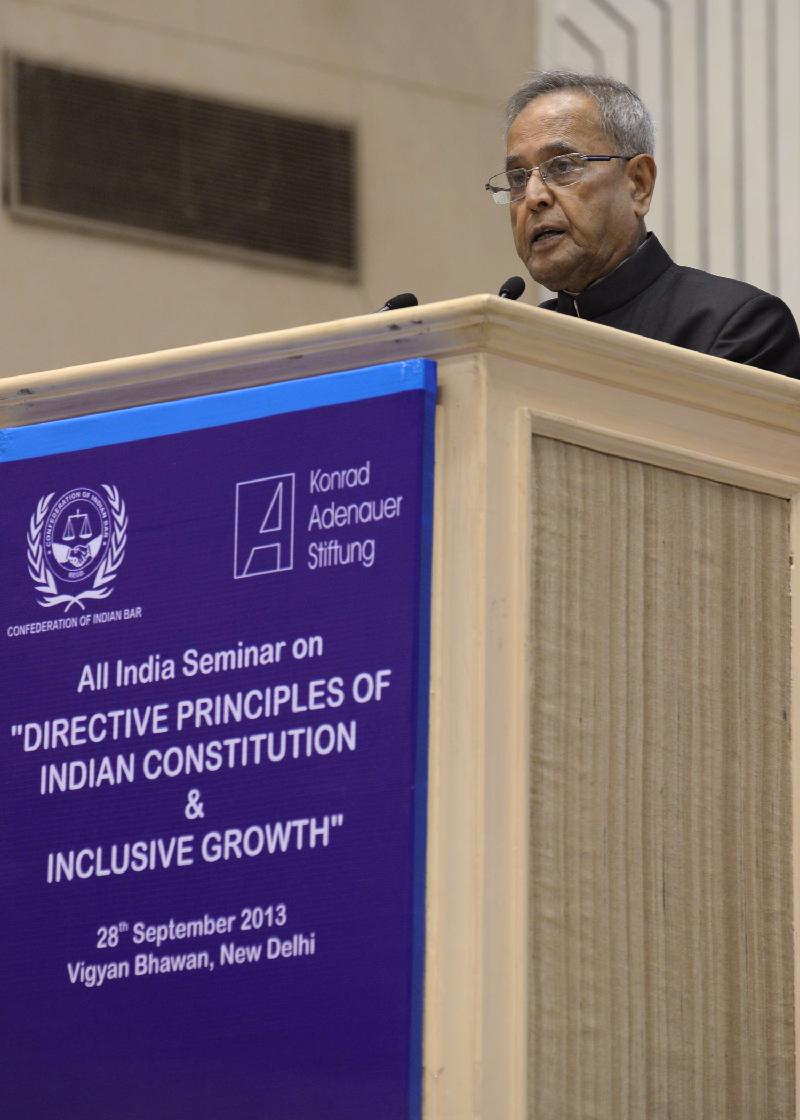 | Caption: | The President of India, Shri Pranab Mukherjee inaugurating the All India seminar on 'Directive Principles of Indian Constitution & Inclusive Growth' being organized by the Confederation of Indian Bar & Konrad Adenauer Foundation at Vigyan Bhavan in New Delhi on Sep 28, 2013 |