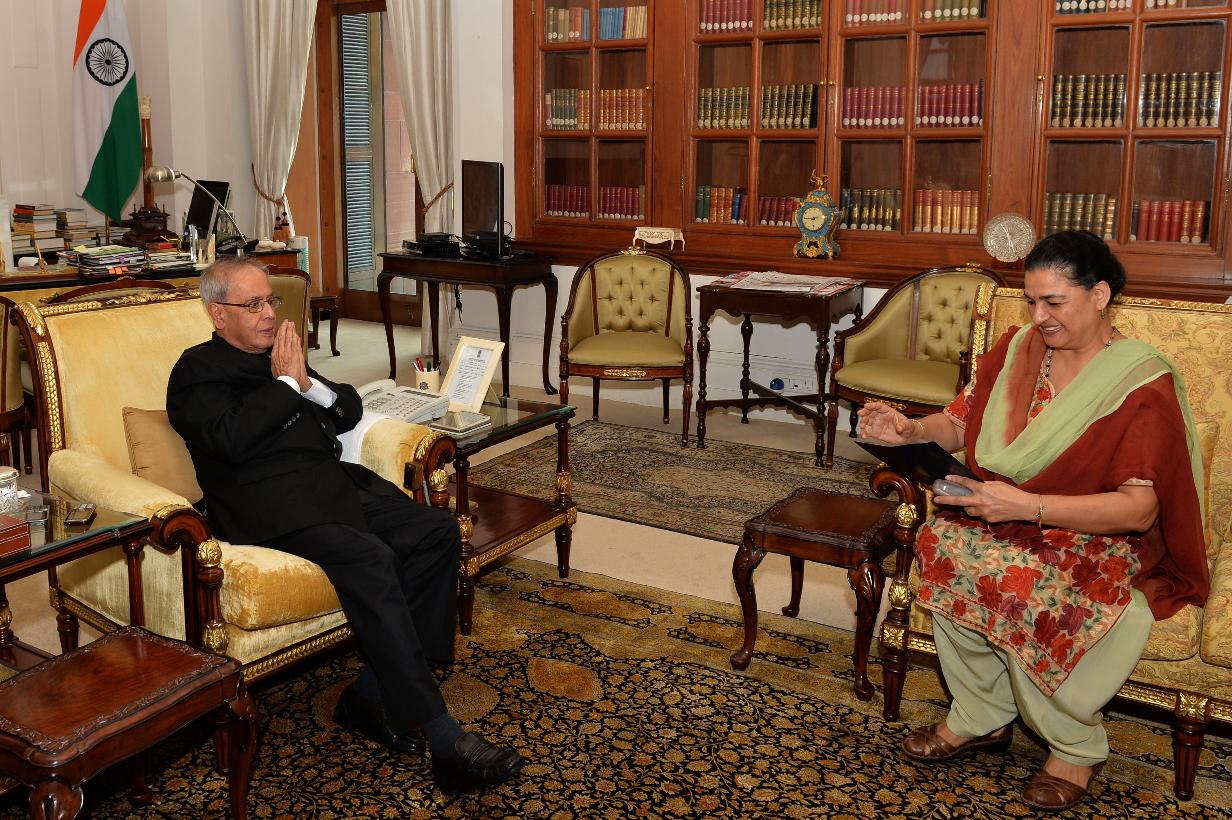 | Caption: | The President of India, Shri Pranab Mukherjee meeting with Ms. Poonam Dabas, at Rashtrapati Bhavan, in New Delhi on September 01, 2015. |