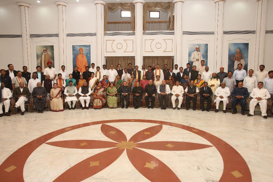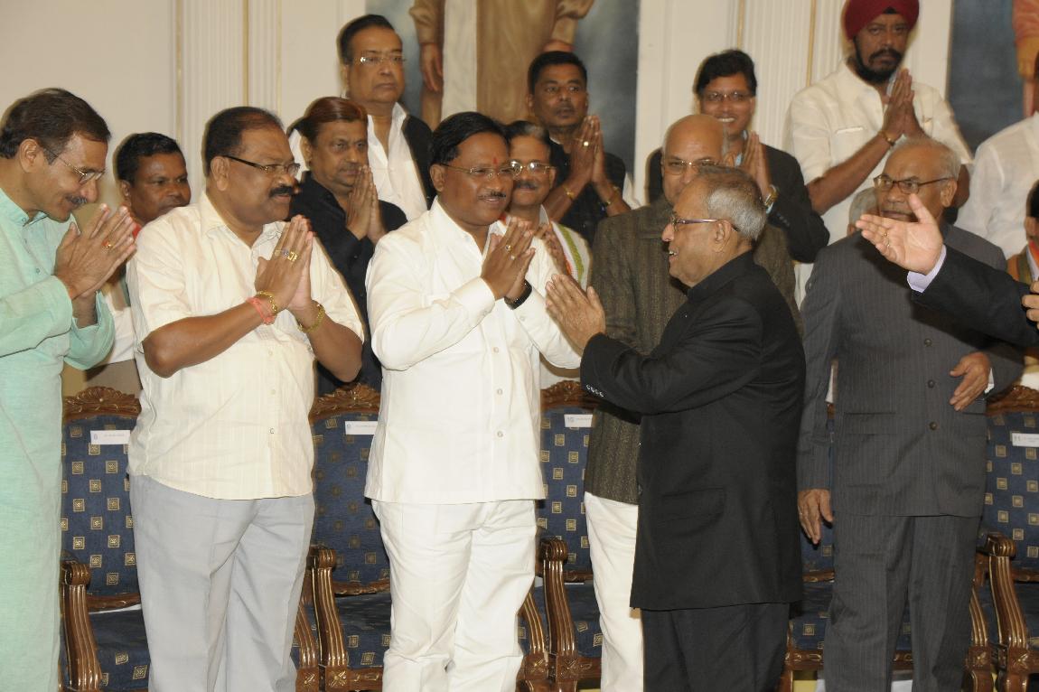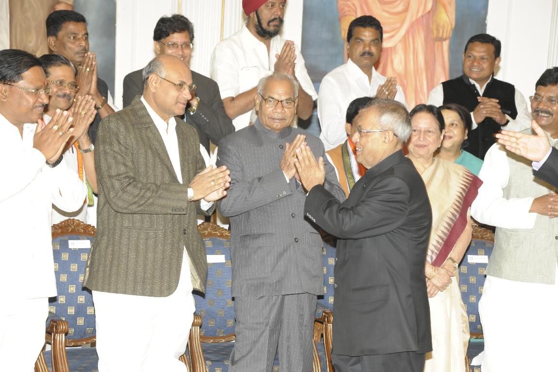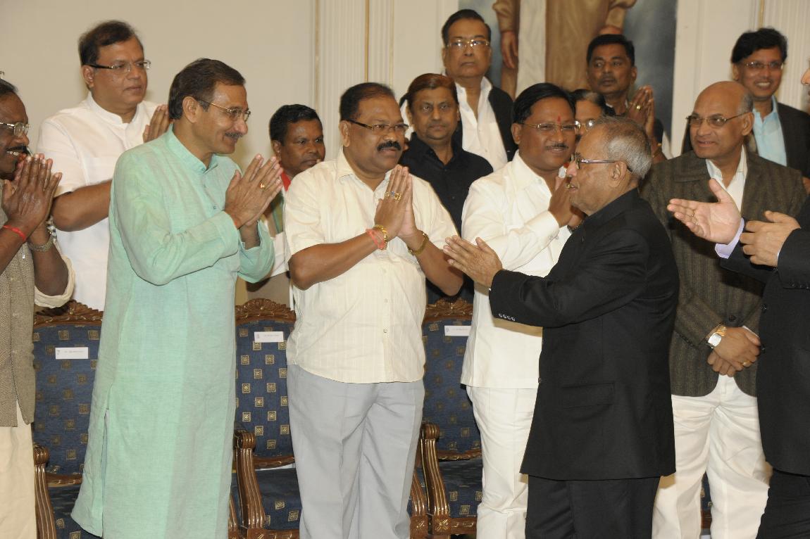 | Caption: | The President of India, Shri Pranab Mukherjee posing For a Group Photographs with MPs & MLAs at Raj Bhavan, Raipur on November 07, 2012 |