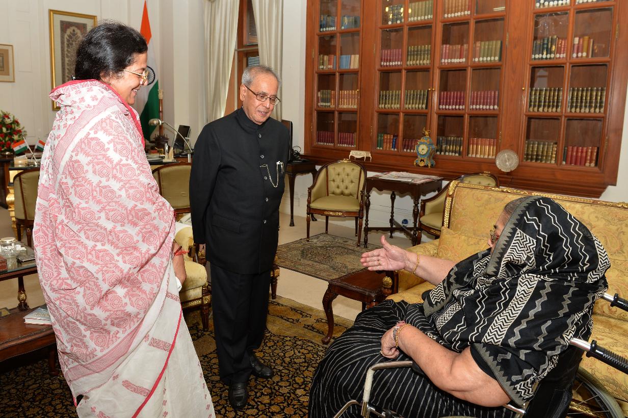 | Caption: | The President of India, Shri Pranab Mukherjee meeting with Smt. Saroj Kumari, wife of late Shri Arjun Singh, former Union Minister alongwith her daughter Ms. Veena Singh, at Rashtrapati Bhavan, in New Delhi on September 01, 2015. |
