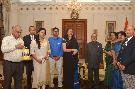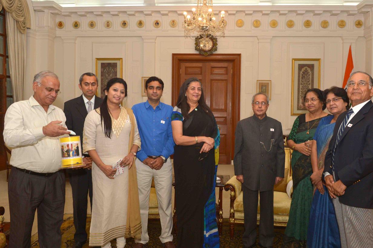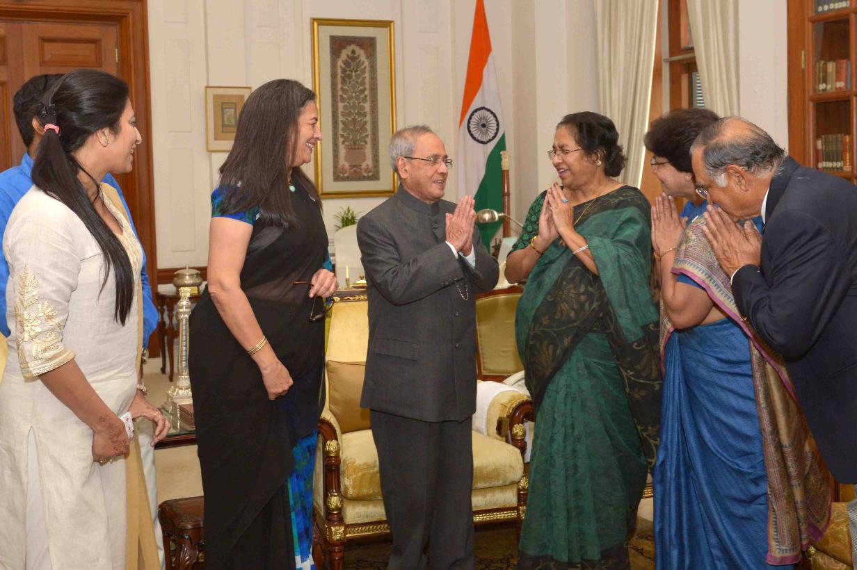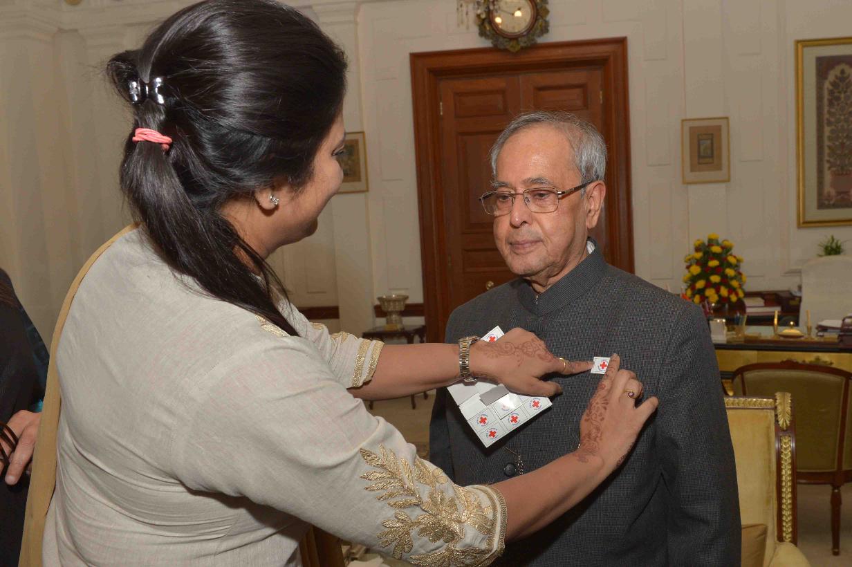 | Caption: | Smt. Ameena Jung, Chairperson along with others from Indian Red Cross Society (National Capital Territory Branch), Delhi pinning a flag to the President of India, Shri Pranab Mukherjee on the occasion of Red Cross Flag Week, at Rashtrapati Bhavan on November 02, 2015. |