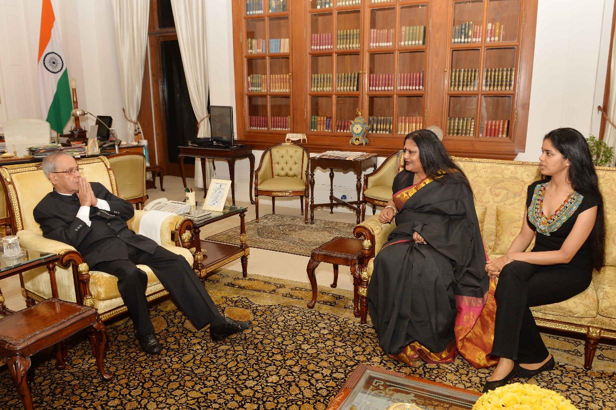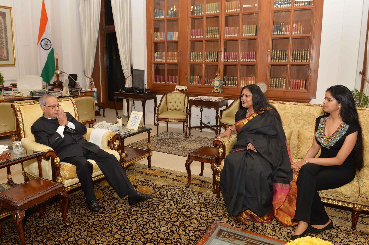 | Caption: | The President of India, Shri Pranab Mukherjee meeting with Smt. Uma Gajapathi Raju alongwith her daughter Ms. Sanchaita Gajapathi Raju, at Rashtrapati Bhavan, in New Delhi on September 19, 2015. |