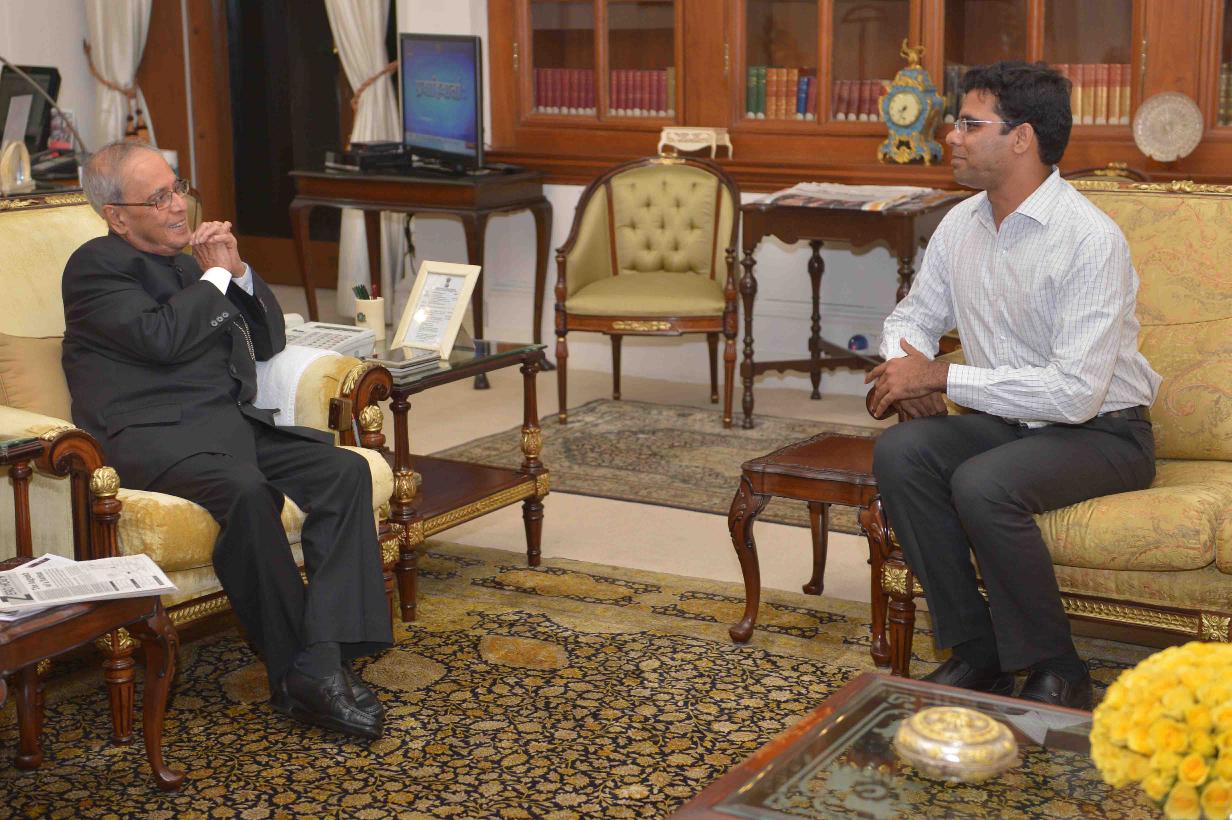 | Caption: | The President of India, Shri Pranab Mukherjee meeting with Shri Neeraj from Sahara Samay, at Rashtrapati Bhavan, in New Delhi on September 19, 2015. |