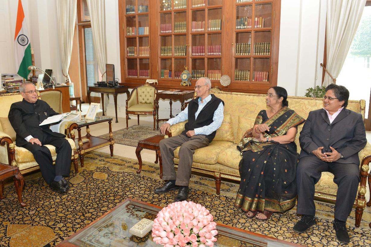 | Caption: | The President of India, Shri Pranab Mukherjee meeting with Shri J.L. Mukherjee and Smt. Purna Mukherjee alongwith their daughter Ms. Koyeli Mukherjee, at Rashtrapati Bhavan, in New Delhi on November 12, 2015. |