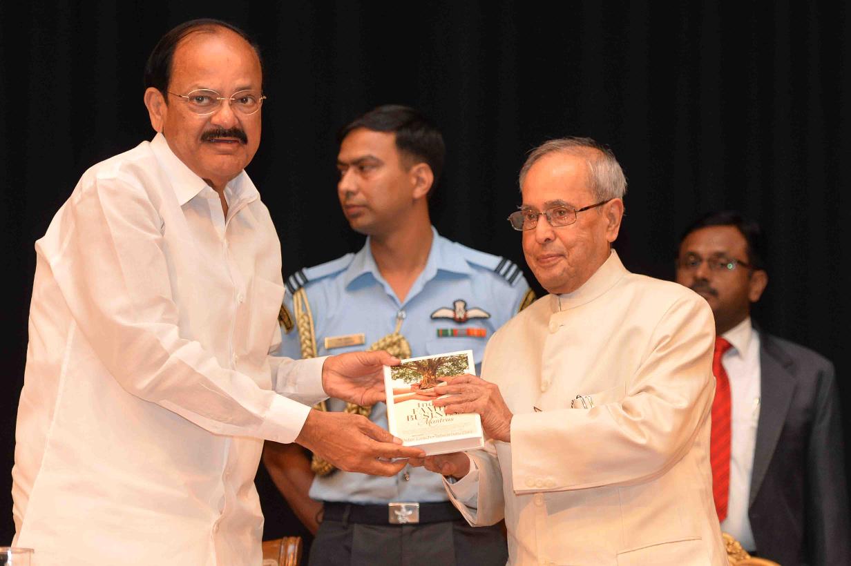 | Caption: | The Union Minister of Urban Development, Housing and Urban Poverty Alleviation and Parliamentary Affairs, Shri M. Venkaiah Naidu presenting the first copy of a book Indian Family Business Mantras authored by Mr. Peter Leach and Mr. Tatwamasi Dixit to the President of India, Shri Pranab Mukherjee, at Rashtrapati Bhavan on October 28, 2015. |