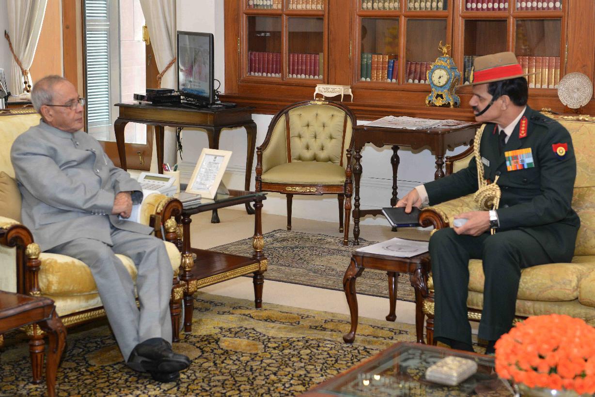 | Caption: | The President of India, Shri Pranab Mukherjee meeting with General Dalbir Singh, Chief of the Army Staff, at Rashtrapati Bhavan, in New Delhi on November 10, 2015. |