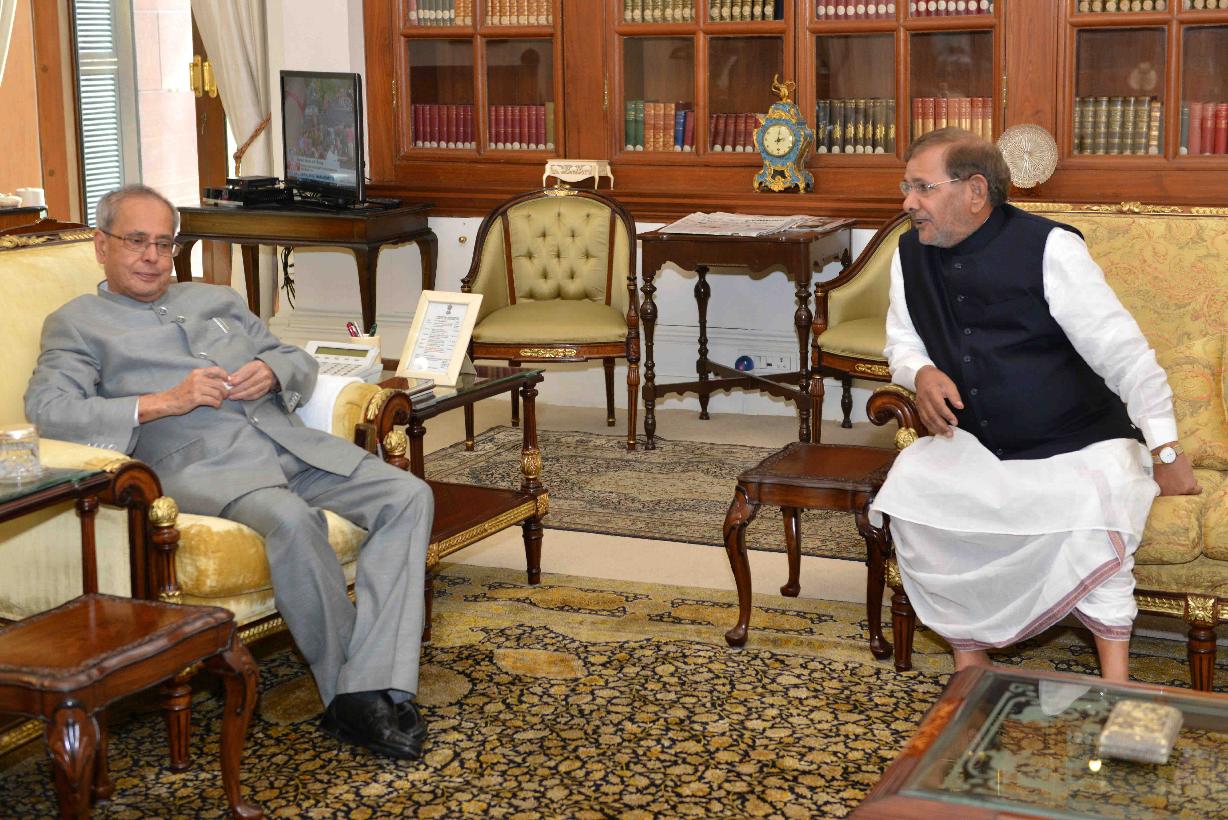 | Caption: | The President of India, Shri Pranab Mukherjee meeting with Shri Sharad Yadav, MP (RS) & President, Janata Dal (United), at Rashtrapati Bhavan, in New Delhi on November 10, 2015. |