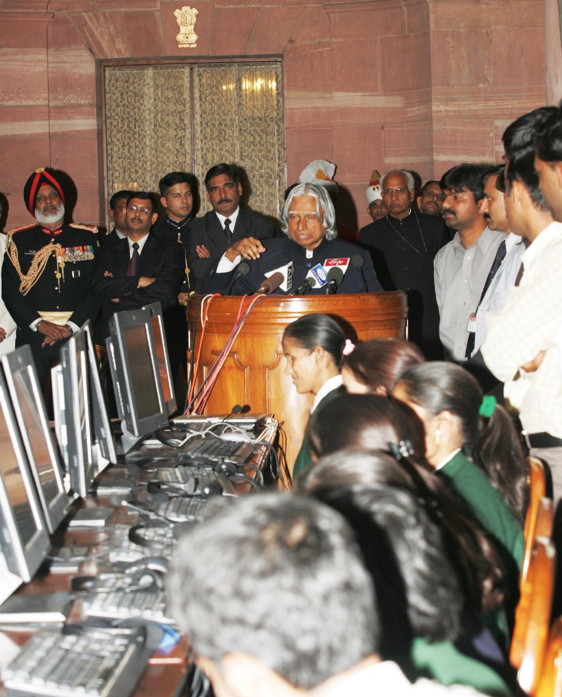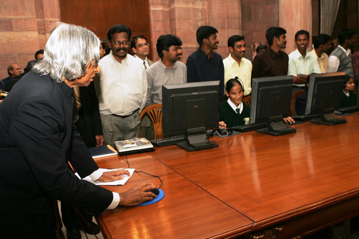 | Caption: | The President of India, Dr A P J Abdul Kalam inaugurating the Speech Applet Virtual Vision at the Intellectual Room of Rashtrapati Bhavan in New Delhi on Jan 26, 2005 |