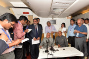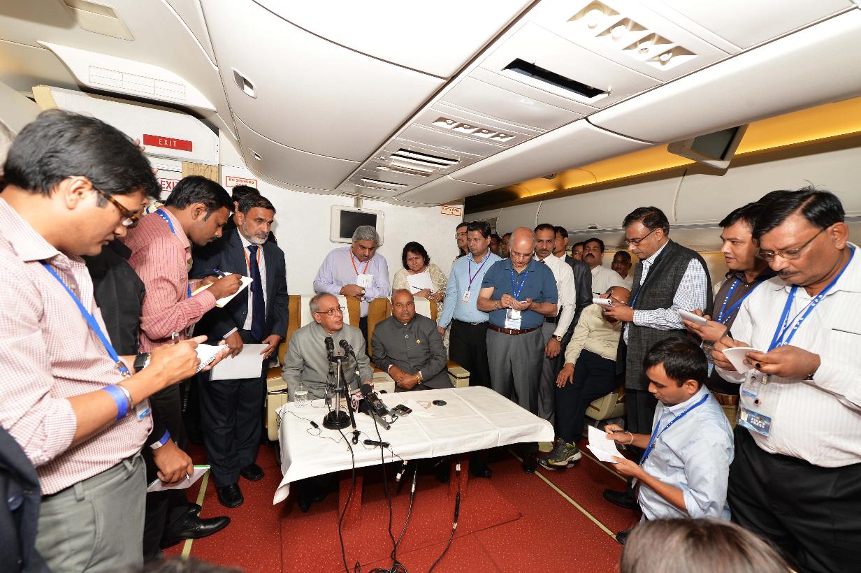 | Caption: | The President of India, Shri Pranab Mukherjee interacting with the media delegation onboard after his State visit of Jordan, Palestine and Israel on October 15, 2015. |