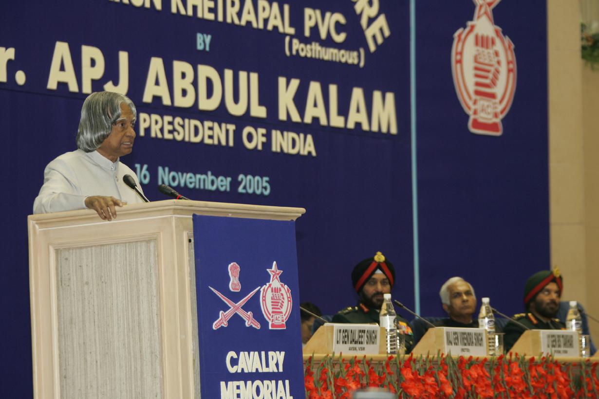| Caption: | The President of India, Dr A P J Abdul Kalam delivering a Lecture in Memory of Second Lt Arun Khetrapal, PVC (Posthumous) of 'the Poona Horse' at Vigyan Bhavan in New Delhi on Nov 16, 2005 |